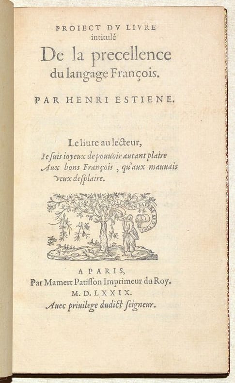 Édition originale rare sortie des presses de Mamert Patisson avec la marque typographique de Robert Estienne sur le titre dont Patisson utilisait l'officine et le matériel depuis qu'il avait épousé sa veuve cinq ans auparavant. Troisième et dernier traité pour l'établissement de la langue française après la Conformité du langage français (1565) et les Deux dialogues (1578), De la Precellence est le volet philologique du projet de Henri Estienne II (1528?-1598) précédé d'une épître adressée à son commanditaire le roi Henri III suivie de la préface au lecteur, l'une et l'autre de l'auteur "et fort longues" (Renouard). « Son amour pour l'antiquité gréco-latine ne l'empêche d'ailleurs nullement de se jeter dans la bataille pour la défense de la langue vulgaire. Il consacre l'essentiel de son activité en langue française à publier trois ouvrages sous forme de tryptique (qui) illustre bien l'ambition d'Estienne de défendre et de mettre en valeur le français dans le Paris de Catherine de Médicis où règne un jargon mêlé de français, d'italien et de latin. Dans la Conformité du langage français, il démontre que le français possède les qualités indispensables pour devenir aussi une langue savante et littéraire. Si la Conformité reste l'ouvrage de l'humaniste philologue, Estienne exercera sa verve et polémique dans les Deux dialogues du nouveau langage français destinés à tous ces courtisans qui prenaient plaisir à parler italien en français. Si le Projet du livre intitulé De la précellence du langage françois s'adresse en premier lieu aux Italiens qui proclament la supériorité de leur langue et de leur littérature, il ne s'en prend pas moins aux latinistes qui condamnaient la langue vulgaire comme inapte à la fonction de la langue littéraire » (En français dans le texte). Reliure discrètement restaurée. Feuillets liminaires dont le titre réparés en marge.Renouard, 181, 3 ; Schreiber 250 ; En français dans le texte, 62.