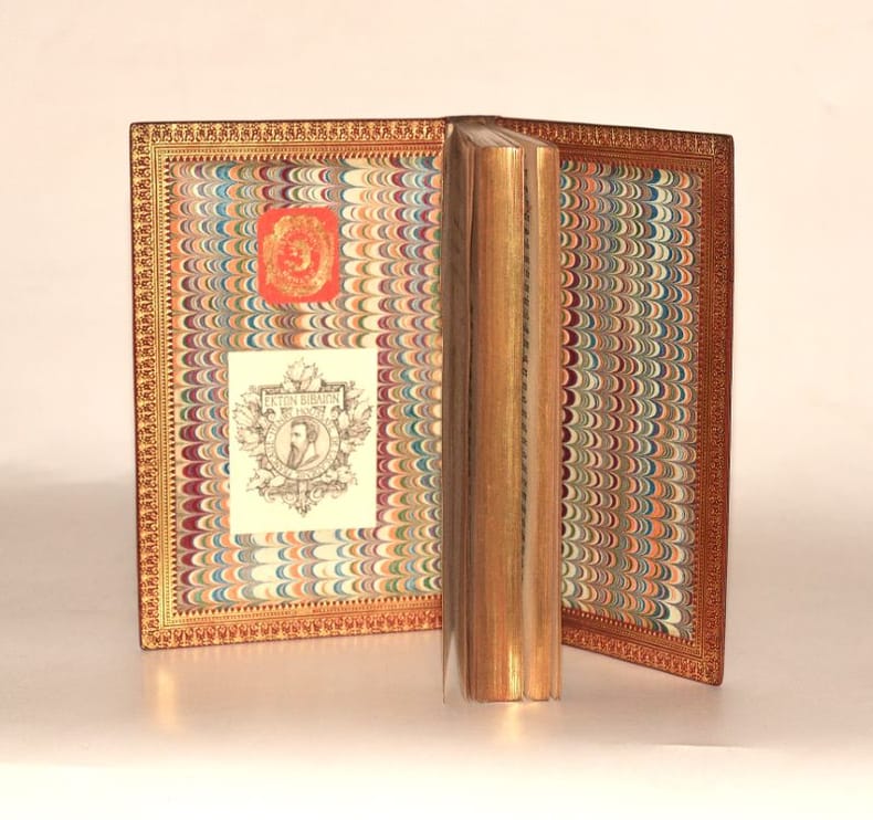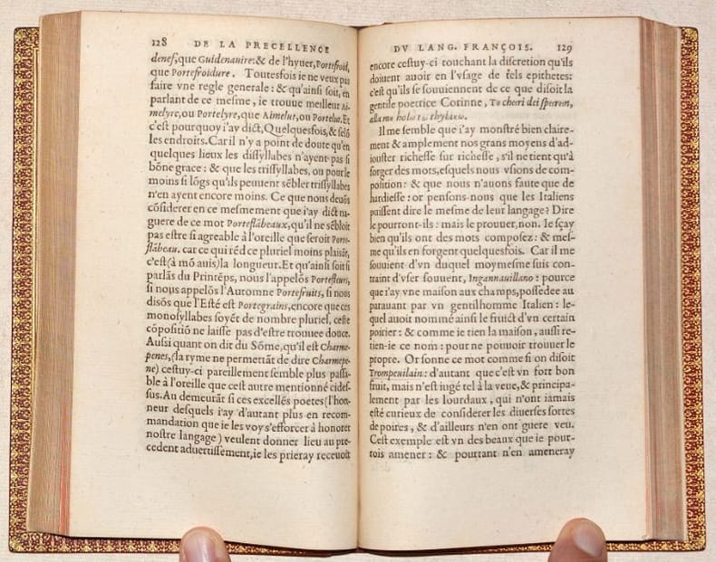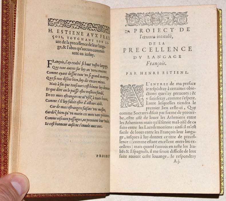 EDITION ORIGINALE de cet ouvrage qui connut un très grand succès à sa parution. Exemplaire avec l’ex-libris gravé "Ex-musaeo Elz. Pin" qui représente un livre ouvert avec le chiffre EP à gauche et les armes à droite. Cet ouvrage, commandé à Estienne par le Roi Henri III est le troisième consacré par l’auteur à la défense de la langue française, qu’il jugeait supérieure à toutes les autres. Rédigé en trois mois, De la Précellence du langage français faisait partie d’un plus vaste projet, d’où le titre de Project de livre, qui ne fut pas mené à son terme (Renouard, 181 ; "En français dans le texte", 62). Mamert Patisson, qui était le beau-frère par alliance de Henri II Estienne, imprimait dans l’atelier familial, l’ouvrage sort des presses des Estienne. Très bel exemplaire, absolument frais, dans une luxueuse reliure fort bien établie.