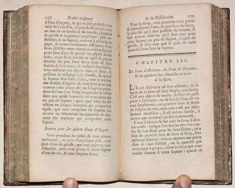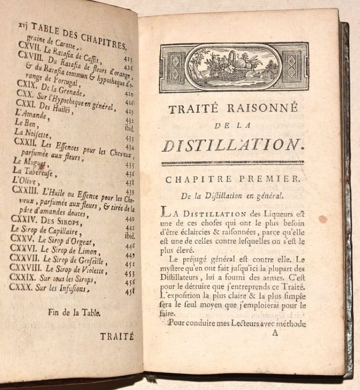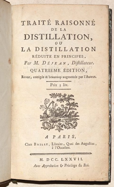 QUATRIÈME ÉDITION, revue, corrigée et beaucoup augmentée par l'auteur de cet ouvrage qu'il dédie « A Messieurs les Maîtres limonadiers-distillateurs de toutes sortes de Liqueurs, Esprit-de-vin, Huiles & Essences, de la Ville & faubourgs de Paris. » Ferdinand DÉJEAN (1728-1797) précise que son ouvrage est le fruit de 20 années d'expérience de distillateur. Son ouvrage est très complet : la distillation en général, des alambics, des accidents qui peuvent survenir, des divers procédés, la fermentation, choix de fleurs, fruits, plantes aromatiques, fleurs d'orangers, roses, lys, oeuillets, jasmins, violettes, lavandes, marjolaine, mélisse, thym, basilic, fruits : cédrats, bergamote, citron, orange. Il y donne la recette de fruits à l'eau de vie, eaux d'épices, café, chocolat, de liqueurs compliquées : eau d'or, d'argent, de noyaux, recettes de parfums et d'huiles de beauté, mais aussi de ratafias, sirops et boissons diverses (notamment la bigarade). La plupart des bibliographies soutiennent que Déjean est le pseudonyme d'Antoine Hornot, distillateur parisien originaire de Nuits-Saint-Georges en Bourgogne mais Duveen en doute et Fritz Ferchl démontre qu'il s'agit bien de Ferdinand Déjean. (Oberlé, "Une Bibliothèque bachique", 405 - Vicaire, 258 - Duveen, 164 - Ferchl, 118). EXEMPLAIRE en BEL ÉTAT, conservé dans sa reliure d'époque habilement restaurée. NICE COPY. PICTURES AND MORE DETAILS ON REQUEST.