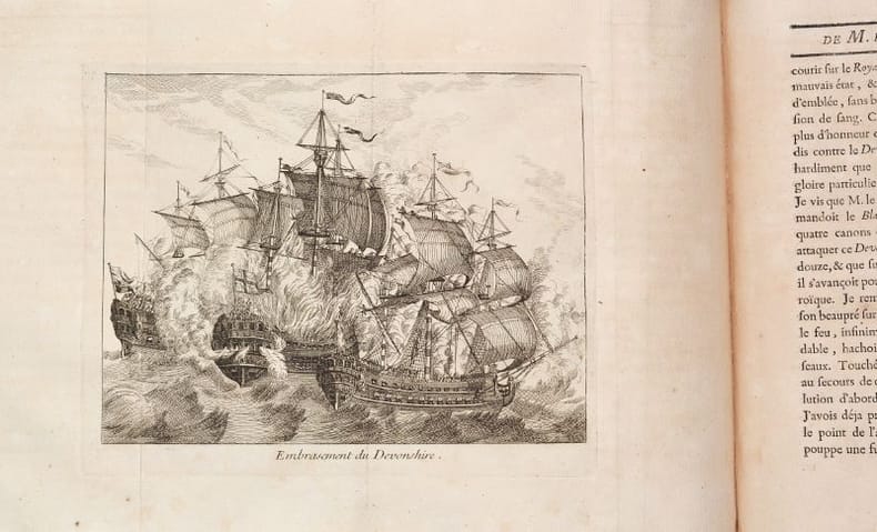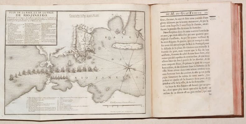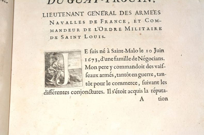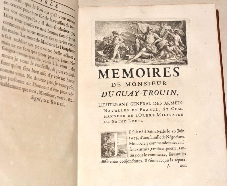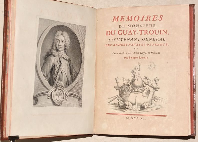 PREMIÈRE ÉDITION au format in-4 de ces FAMEUX MÉMOIRES DU CORSAIRE MALOUIN. C'est la meilleure édition, non seulement parce que c'est la plus belle, mais également parce que c'est la première autorisée et qu'elle contient le texte définitif. Elle a été réalisée par les soins de Gaudard de Beauchamp, ami de Duguay-Trouin et de La Garde-Jazier, son neveu : « M. de La Garde attentif à tout ce qui peut contribuer à la gloire d'un oncle tel que M. du Guay, n'a rien épargné pour l'embellissement de ses mémoires. On en jugera par les différentes planches répandues dans le corps de l'ouvrage, par la beauté des caractères, & par celle du papier. » (Avertissement, page XIV). Elle est illustrée en frontispice d'un PORTRAIT de l'auteur par Larmessin, d'une grande vignette de titre, d'un bandeau et d'une lettrine gravés par Fessard, d'un PLAN dépliant de la baie et de la ville de RIO DE JANEIRO par Coquart et de 5 PLANCHES gravées en taille-douce par Lebas, dont 4 dépliantes, représentant des scènes de batailles navales et d'abordages. Ces "Mémoires" du célèbre corsaire René TROUIN, sieur du Gué, dit DUGUAY-TROUIN (1673-1736), probablement rédigés vers 1720-1721, n'étaient pas destinés à être publiés de son vivant. Mais après qu'il en ait confié le manuscrit au Cardinal Dubois qui désirait le lire, et de multiples péripéties, cinq éditions clandestines, au texte fautif, parurent de 1730 à 1735. Dans cet ouvrage rédigé avec un style élégant et sobre ainsi que d'une étonnante sincérité, Duguay-Trouin n'hésite pas à faire part de ses doutes et de ses faiblesses dans le récit de ses exploits. Ces "Mémoires" constituent ainsi un PRÉCIEUX TÉMOIGNAGE SUR LA MARINE à la fin du XVIIe et au début du XVIIIe siècle, tant sur la navigation que sur la vie à bord et le combat naval. On trouve à la fin de l'ouvrage la liste des vaisseaux commandés par Duguay-Trouin et la mention des membres d'équipages. (Polak, 2855 : « Plusieurs éditions parues de cet ouvrage, la meilleure étant celle in-4° » - Borba de Moraes, I-272 - Cohen, 334 qui ne mentionne que 4 planches - Brunet, II-1780 - Sabin, 29098, qui ne mentionne que l'édition in-12). TRÈS BEL EXEMPLAIRE conservé dans sa fraîche reliure d'époque, complet des planches. NICE COPY. PICTURES AND MORE DETAILS ON REQUEST.