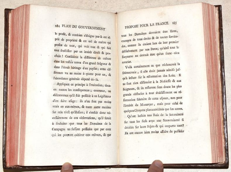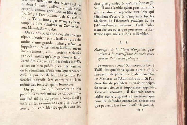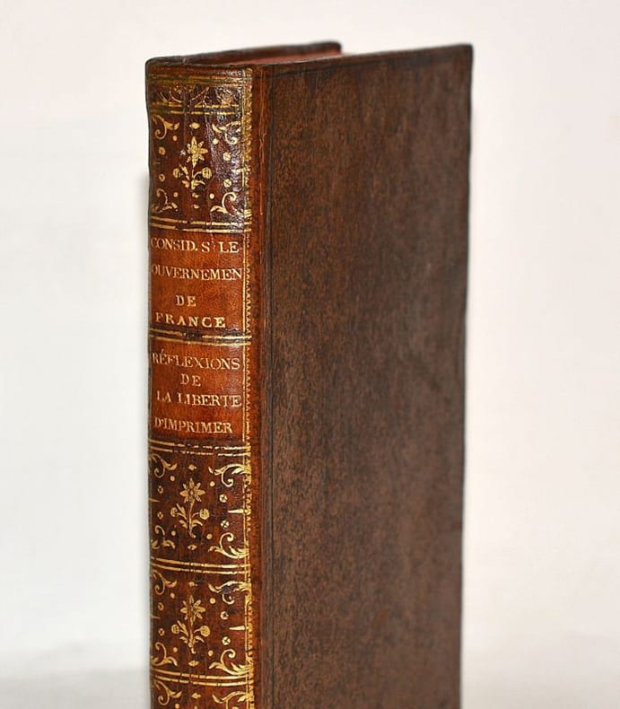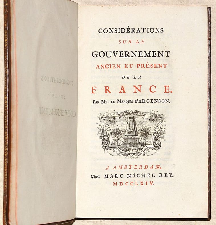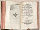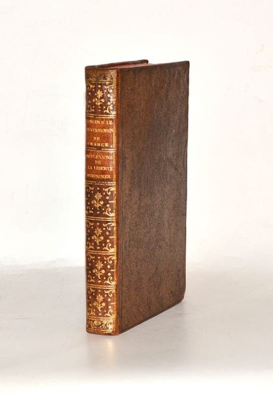 ÉDITION ORIGINALE de cette oeuvre posthume du marquis d'ARGENSON (1694-1757), publiée par son fils, après que des versions manuscrites aient circulé dès 1739 auprès des initiés. Secrétaire d'État des Affaires étrangères de Louis XV de 1744 à 1747, son incapacité à pousser l'avantage diplomatique de la France après la victoire de Fontenoy (mai 1745) l'expose aux critiques et conduit à sa démission en janvier 1747. L'originalité des idées émises dans cet ouvrage concernant la nature et l'évolution des institutions politiques et sociales furent composées pour l'essentiel dès 1734 et furent louées par Jean-Jacques Rousseau dans "Du contrat social" (1762) ainsi que par Voltaire. Précurseur des physiocrates et d'Adam Smith, partisan de la liberté du commerce et critique envers les réglementations étatiques, il y examine « jusqu'où la démocratie peut être admise dans un État monarchique ». (Ined, 87 : « Sa doctrine économique a de nombreux points communs avec celle des disciples de Quesnay. Si les physiocrates ne reconnurent pas en d'Argenson un précurseur direct, du moins ils lui adressèrent les mêmes éloges qu'à Gournay. » - Jammes, "Le Bûcher bibliographique", 481, pour l'édition de 1765 ) - [Relié à la suite :] "RÉFLEXIONS SUR LES AVANTAGES DE LA LIBERTÉ D'ÉCRIRE ET D'IMPRIMER SUR LES MATIÈRES DE L'ADMINISTRATION [etc.]". ÉDITION ORIGINALE RARISSIME de cette oeuvre de l'encyclopédiste et économiste français André MORELLET (1727-1819), surnommé par Voltaire « L'abbé Mord-les » en raison de la causticité de certaines de ses publications. Dans celle-ci, l'abbé Morellet s'attache surtout à défendre la liberté de la presse au bénéfice des Économistes. En effet, s'avérant dès l'abord ennemi de toute prohibition, il en arrive rapidement à démontrer l'utilité d'une parfaite connaissance de l'économie politique qu'entraverait toute censure. Malgré les mesures révolutionnaires qui l'avaient dépouillé de sa fortune, l'abbé Morellet a défendu la « philosophie des Lumières » jusqu'à sa mort. (Ined, 3312). TRÈS BEL EXEMPLAIRE de ces deux ouvrages ayant trait à l'économie politique et à la finance, conservés ensemble dans une reliure d'époque intacte, aux corps d'ouvrages frais. FINE COPY. PICTURES AND MORE DETAILS ON REQUEST.