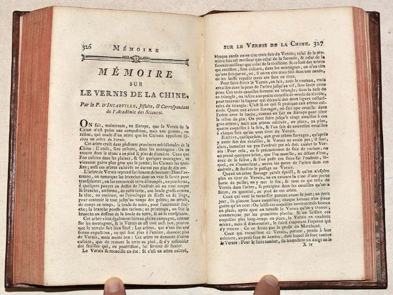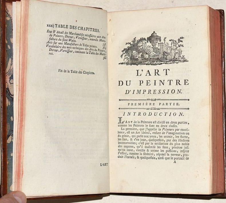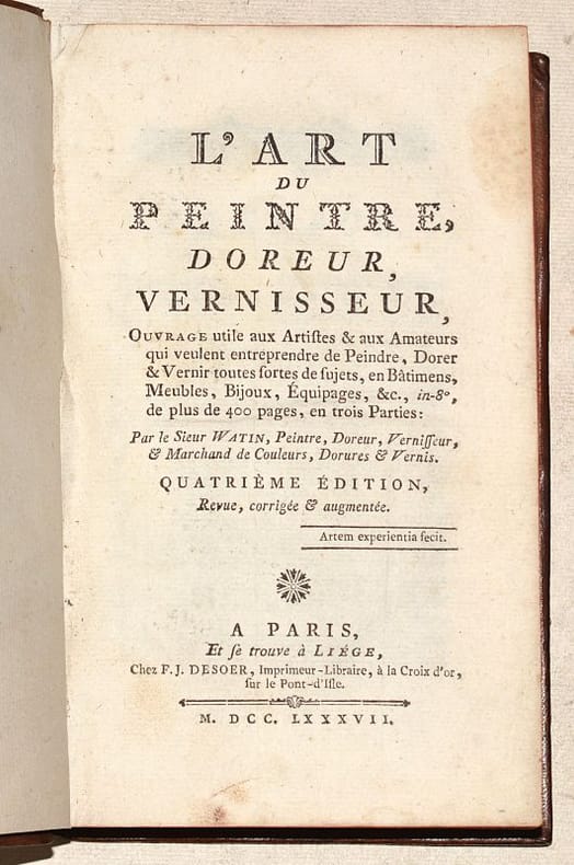 QUATRIÈME ÉDITION, revue, corrigée et augmentée de ce FAMEUX TRAITÉ à l'usage des artistes et amateurs par le peintre, doreur, vernisseur et marchand de couleurs, dorures et vernis, Jean-Félix WATIN (né en 1728). Dans cet ouvrage divisé en TROIS PARTIES, il détaille tout d'abord la composition des couleurs, le moyen de les fabriquer, de la détrempe, de la peinture à l'huile, etc. puis dans "L'Art du doreur", la dorure à l'or, à l'huile, la manière de bronzer les fers, de nettoyer les vieilles dorures, etc. et enfin dans "L'Art du vernisseur", il explique l'emploi des vernis, la manière d'imiter les laques, de polir, lustrer, rafraîchir et détruire les couleurs et vernis, etc. On trouve à la suite le "Mémoire sur le vernis de la Chine" (pages 326 à 346) du jésuite passionné de botanique Pierre Nicolas Le Chéron d'Incarville (1706-1757) qui séjourna en Chine de 1740 à sa mort, et qui donne de nombreux détails sur « l'arbre de vernis », la préparation des différents vernis, le travail, l'application et la peinture du vernis, etc. TRÈS BEL EXEMPLAIRE conservé dans une reliure d'époque intacte, au corps d'ouvrage frais. FINE COPY. PICTURES AND MORE DETAILS ON REQUEST.