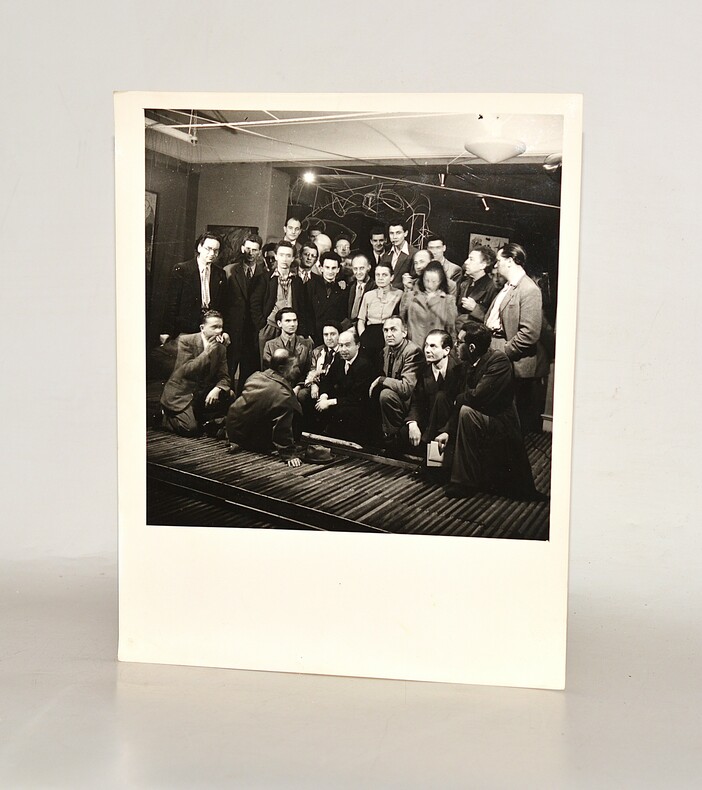 BEAU TIRAGE ARGENTIQUE D'ÉPOQUE. Il s'agit d'une variante de la célèbre photographie prise par Denise BELLON (1902-1999) à la Galerie Aimé Maeght lors de l'exposition internationale du surréalisme en 1947 et sur laquelle apparaissent Maurice Baskine, Pierre Demarne, Maurice Henry, Jerzy Kujawski, Claude Tarnaud, Francis Bouvet, Enrico Donati, Marcel Jean, Jacques Kober, Stanislas Rodanski, Gaston Criel, Hans Bellmer, André Breton, Henri Seigle, Henri Pastoureau, Bernard Gheerbrant, Victor Brauner, Sarane Alexandrian, Toyen, Madame Seigle, Nora Mitrani, Jacques Hérold, Henri Goetz, Frédéric Delanglade, Matta, Frederik Kiesler, Jindrich Heisler, Aimé Maeght et Ervin Marton. Sur cette photographie le visage de Nora Mitrani est floue et Frederik Kiesler, assis en imperméable au premier rang, est de dos. (Vente 30 mai 2024, "La Hune - Collection Gheerbrant. Premier jour.", n°60). BEAU ET RARE DOCUMENT, en PARFAIT ÉTAT. FINE COPY. PICTURES AND MORE DETAILS ON REQUEST.
