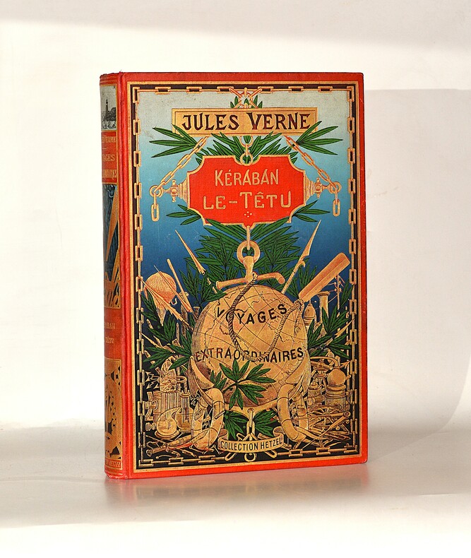 J. Hetzel éditeur, coll. « Collection Hetzel Voyages Extraordinaires » 1890 In-8 Jésus, cartonnage pleine toile rouge éditeur, dos à nerfs, caissons ornés, tranches dorées, frontispice et page de titre gravée et sous serpente, 407 pp. Coins usés et émoussés.