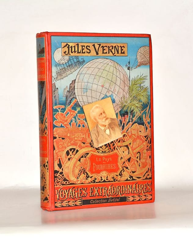 ÉDITION COLLECTIVE GRAND IN-8 ILLUSTRÉE conservée dans son cartonnage éditeur polychrome décoré « au portrait collé », avec le dos « au phare », de la série des « Voyages extraordinaires ». 105 DESSINS en noir par FÉRAT et BEAUREPAIRE dont un frontispice, une gravure au titre, 5 en-têtes de chapitre, 96 gravures dans le texte et 2 cartes. (Jauzac, 195). Exemplaire en BEL ÉTAT. NICE COPY. PICTURES AND MORE DETAILS ON REQUEST.