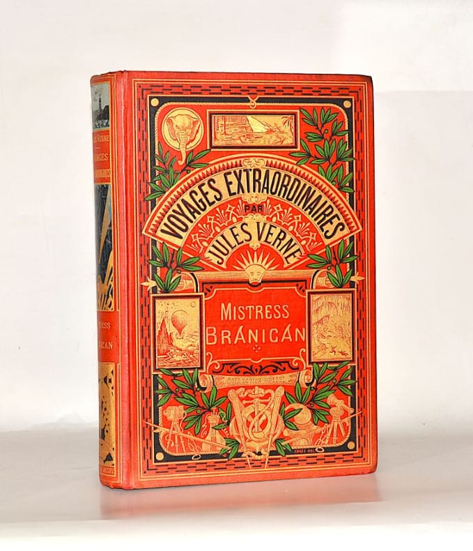 Les Voyages Extraordinaires. 83 dessins de L. Benett. 12 grandes gravures en chromotypographie. 2 grandes cartes en chromolithographie.Première édition. Bibliothèque d'Éducation et de Récréation J. Hetzel et Cie. - 1891 - 440 pages. Catalogue FX pour 1891-1892. Imprimé par Gauthier-Villars, relié par Lenègre.Cartonnage polychrome Hetzel au portrait imprimé. Dos au phare. 1er type : Cartouche Rouge au bas du plat supérieur (uniquement pour Mistress Branican). Tranches dorées. Gouttière régulière. Rares rousseurs. Très bon état. Format in-4°(28x19).