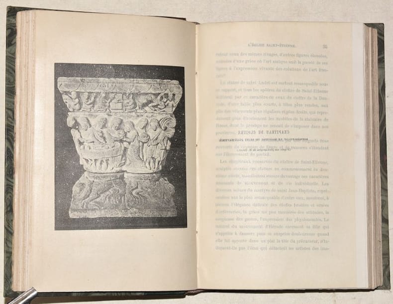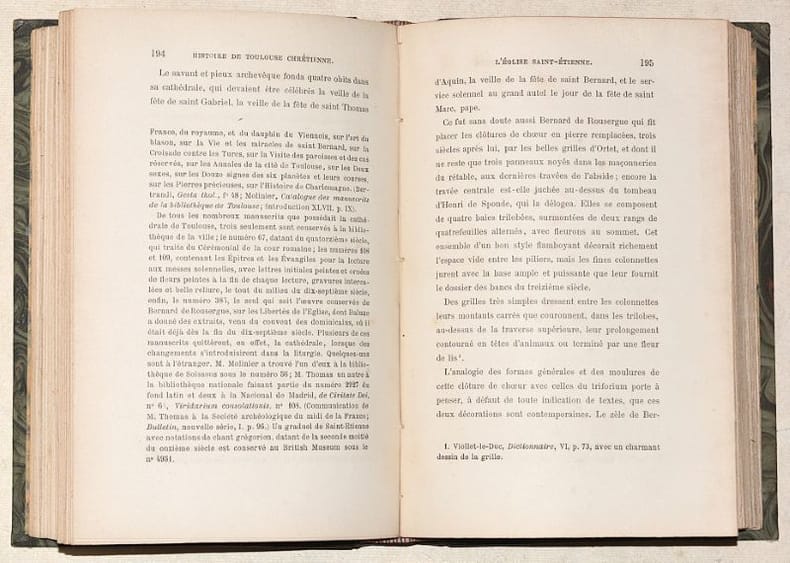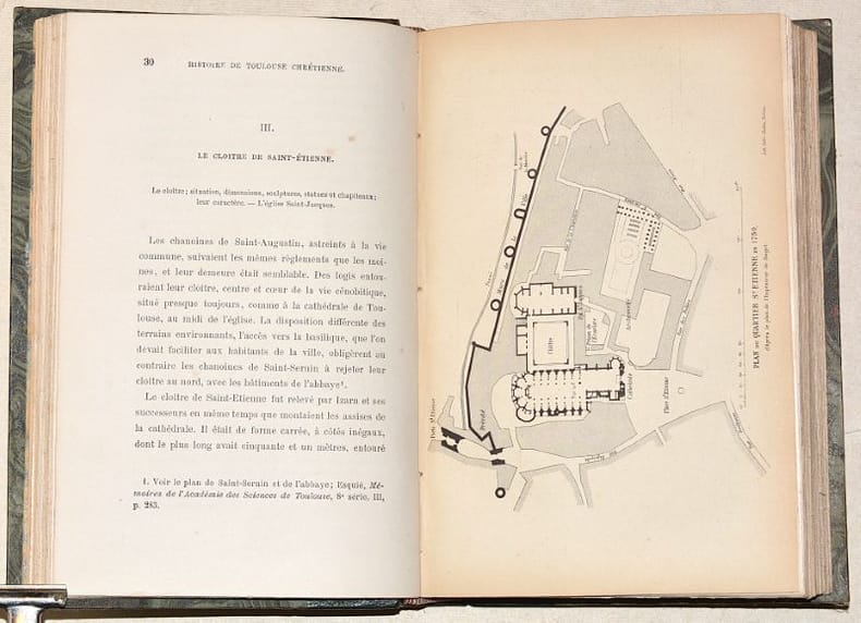 1890 Toulouse, Privat, 1890. In-8 (219 X 152 mm) demi-basane vert lierre, dos à nerfs filetés or, caissons ornés de fers dorés, titre doré, plats de la couverture d'origine conservés ; frontispice sous serpente légendée, XLV-482 pages, 13 planches hors-texte sous serpentes légendées, 2 plans. Teinte du dos uniformément virée en teinte havane, rousseurs très éparses, plus marquées à quelques rares feuillets.