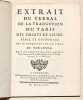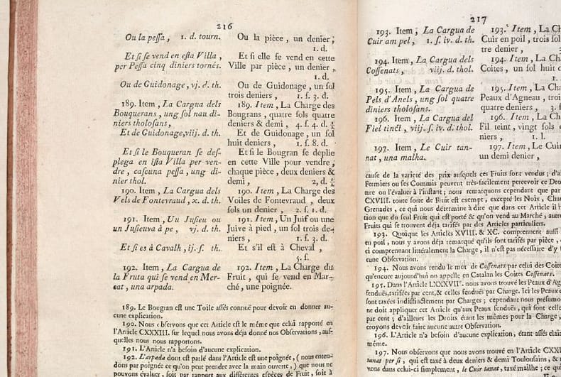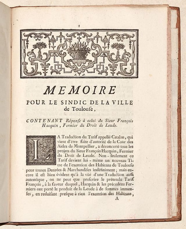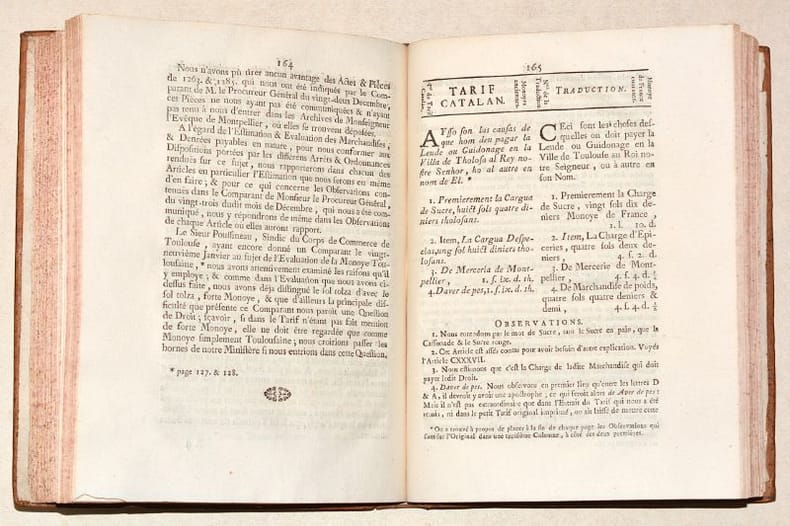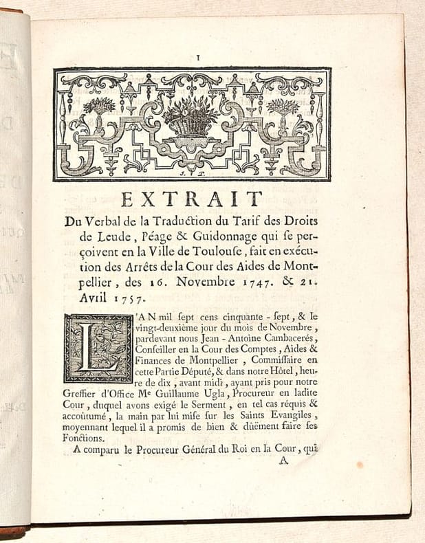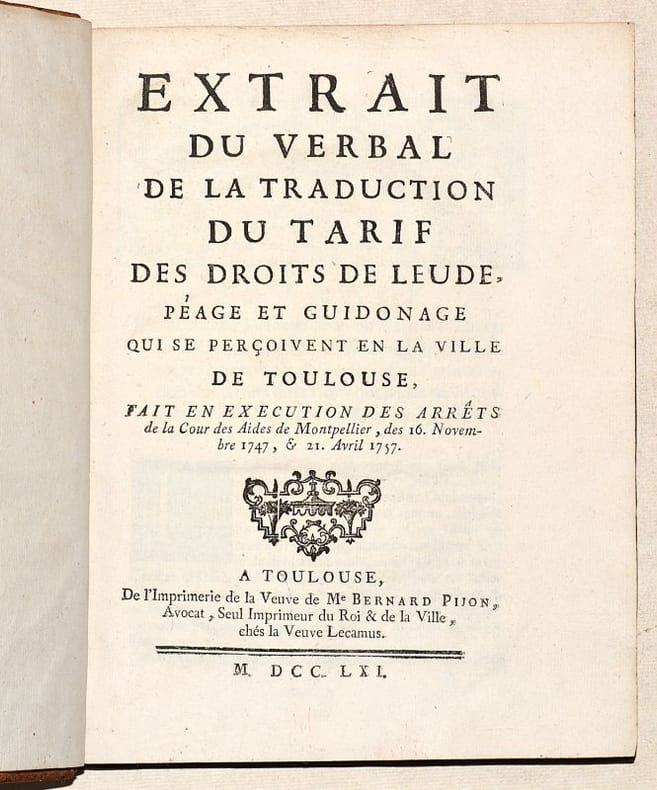 ÉDITION ORIGINALE de ce RARE OUVRAGE qui détaille les impositions perçues en la ville de Toulouse, pour le commerce, le transport et le droit d'aide. On trouve ainsi mentionné page 216 un droit de passage « d'un sol et trois deniers pour un Juif ou une Juive à pied et 5 sols s'il est à cheval ». Les tarifs pratiqués sont détaillés avec soin des pages 165 à 221, à 2 colonnes, avec à gauche le tarif catalan et à droite la traduction en monnaie de France courante. L'ouvrage est bien complet de la partie intitulée "MÉMOIRE POUR LE SINDIC DE LA VILLE DE TOULOUSE contenant Réponse à celui du Sieur François Hacquin, Fermier du Droit de Leude" (34 pages). Exemplaire en BEL ÉTAT, à la reliure d'époque intacte et au corps d'ouvrage frais. FINE COPY. PICTURES AND MORE DETAILS ON REQUEST.
