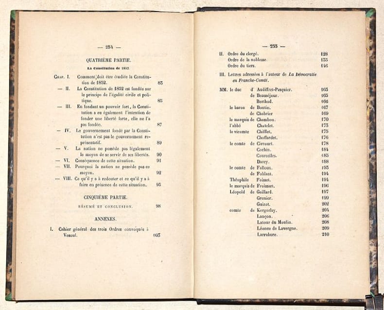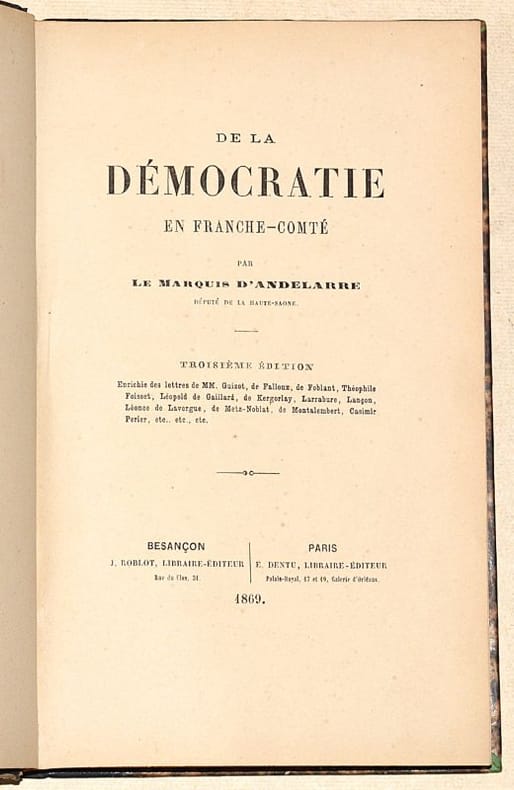 TROISIÈME ÉDITION, augmentée d'une quarantaine de LETTRES adressées à l'auteur par des correspondants tels que le duc d'Audiffret-Pasquier, le duc de Beauséjour, Berthod, le baron de Bontin, le baron de Chabrier, le marquis de Chambon, l'abbé Chatelet, le vicomte Chifflet, Guizot, le comte de Montalembert, etc. Jules Jacquot Rouhier d'ANDELARRE (1803-1885) est un homme politique français, magistrat sous la Restauration, député de la Haute-Saône avant d'adhérer au tiers-parti libéral. En 1871, il est représentant de la Haute-Saône, siégeant avec les monarchistes orléanistes.Exemplaire en BEL ÉTAT de cet ouvrage RARE, bien conservé, dans sa reliure d'époque intacte. NICE COPY. PICTURES AND MORE DETAILS ON REQUEST.