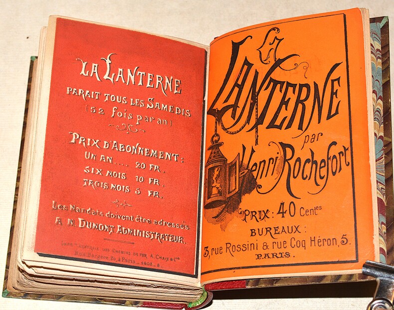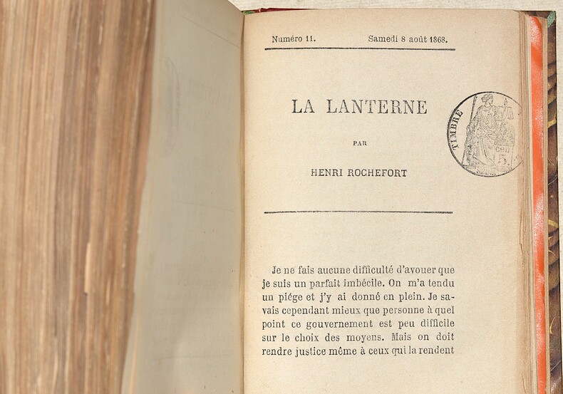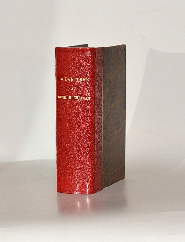 1868 Paris, La Lanterne, 1868. Onze numéros reliés en un volume petit in-12 (150 X 110 mm) demi-maroquin rouge, dos lisse, titre doré, 2 couvertures conservées (Marius Michel) ; [numéros 1 à 8 :] 483 pages, (1) f. - [numéro 9 :] 58 pages, (2) ff. - [numéro 10 :] 58 pages, (2) ff. - [numéro 11 :] 59 pages, (1) f. Cachet encré "Timbre Impérial - 5 cts - Seine" en marge du premier feuillet de chaque numéro.