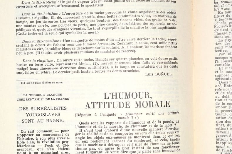 ÉDITION ORIGINALE du sixième et dernier numéro de cette revue qui succède à la "Révolution surréaliste" et marque l'entrée du surréalisme dans sa période politique. Contributions d'André Breton, Artür Harfaux, Maurice Henry, Zdenko Reich, Luis Buñuel, Marco Ristitch, Yves Tanguy, Max Ernst, André et Marcel Jean, René Char, Tristan Tzara. Poèmes de Hans Arp, Henri Baranger, M. Blecher, Georges Hugnet, Douchan Matitch, Benjamin Péret, Gui Rosey. Hors-textes de René Magritte, Alberto Giacometti, Max Ernst, André Breton, Paul Éluard, Valentine Hugo, Salvador Dalí, Yves Tanguy. BON EXEMPLAIRE, au corps d'ouvrage en BEL ÉTAT. GOOD COPY. PICTURES AND MORE DETAILS ON REQUEST.