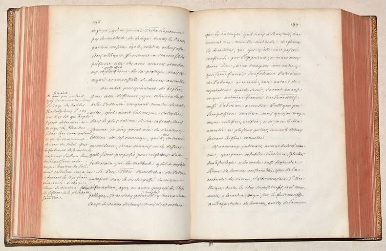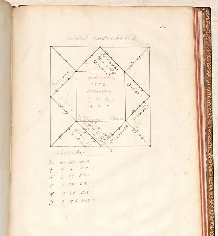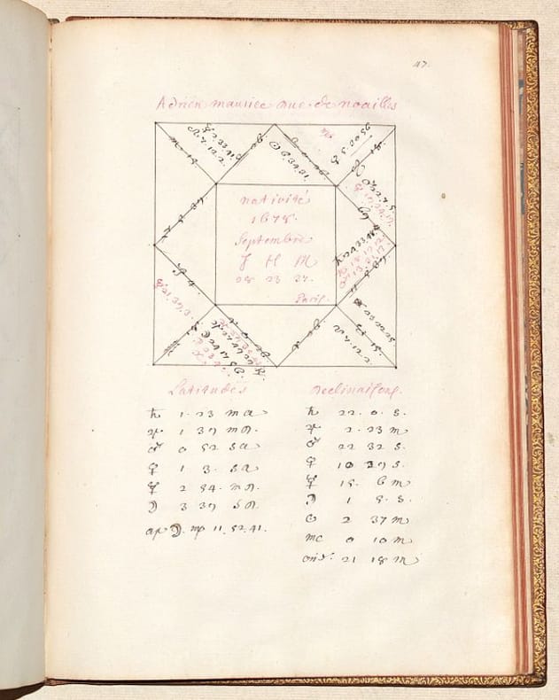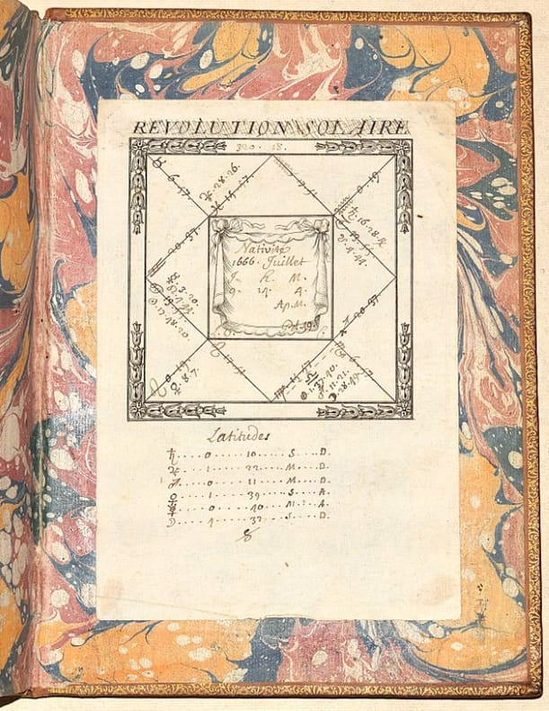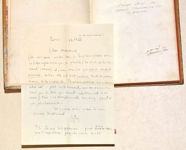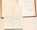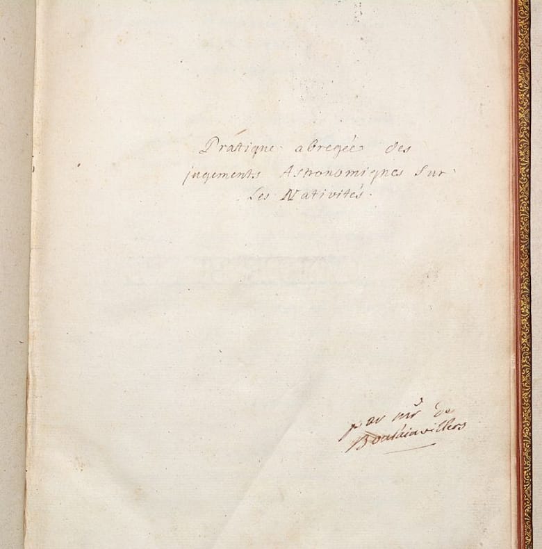 IMPORTANT MANUSCRIT rédigé de la main de l'auteur, Henri de BOULAINVILLIERS (1658-1722), militaire, historien et astrologue français, père de la « libre pensée » et l'un des premiers historiens à avoir considéré l'art de gouverner comme une science. En examinant les titres de ses ancêtres, il fut entraîné à étudier l'histoire de son pays, et dirigea surtout ses recherches vers la nature des institutions politiques du moyen âge, et l'origine des anciennes familles du royaume. Il voyait dans le gouvernement, ou plutôt l'anarchie féodale, le "chef-d'oeuvre de l'esprit humain" ; tout progrès, soit de l'autorité royale, soit des libertés civiles ou municipales des roturiers, était pour lui une usurpation au détriment des droits de la noblesse, seule héritière des francs, conquérants de la Gaule. Il a écrit de nombreux ouvrages sur divers sujets : histoire, astrologie judiciaire, critique religieuse, recherches de statistique, plans de réforme, métaphysique et philosophie (il réalisa la première traduction française de "L’Éthique" de Spinoza), mais aucun de ces écrits ne furent publiés de son vivant et ce n'est qu'à titre posthume, à partir de 1727, que certains d'entre eux furent imprimés. Quelques textes, néanmoins, circulèrent sous forme de manuscrits, copiés par ses amis ou restitués sous la plume de copistes professionnels. L'intégralité du manuscrit, ainsi que les corrections, ratures et ajouts qui émaillent le manuscrit, sont de la même main. À la fin du texte manuscrit on trouve cette mention « Fin / le 16 D'aoust 1717 a 9 heures du soir », toujours de la même main. La mention autographe ancienne sur la page de titre « par Mr De Boulainvillers » est par contre d'une autre main. Ce manuscrit, précédé d'un avertissement (9 pages), est divisé en 3 PARTIES : "Pratique Abrégée des jugements Astrologiques sur les nativités" (1ère partie, pages 11 à 167) - "Des significations de la vie" (deuxième partie, article 1er, pages 167 à 631) - "Des directions en général" (Troisième partie, article 1er, pages 632 à la fin). Suivent ensuite 68 THÈMES ASTRAUX DE GRANDS PERSONNAGES, rédigés en rouge et noir sur 68 feuillets numérotés de 1 à 68 : de Philippe II Auguste, roi de France né en 1165 (n°1) à Érasme, né en 1467 (né en 1467). Parmi ces 68 personnalités, on trouve de nombreux rois et reines de France, de grands noms de la noblesse française, mais aussi Nicolas Fouquet et Michel de Nostradamus. Sur le second contreplat a été collé un thème astral manuscrit intitulé "RÉVOLUTION SOLAIRE", daté de juillet 1666, toujours de la même main. Ce manuscrit n'a été publié qu'en 1947 aux "Éditions du nouvel humanisme" et seulement 3 EXEMPLAIRES de ce manuscrit sont signalés dans les collections publiques (2 à la BNF et 1 à la BM d'Angoulème). Une LETTRE AUTOGRAPHE d'une page, contrecollée sur la première contregarde, à en-tête « 16, Rue Saint Guillaume. 7e. », datée « Paris. 12. IX. 58 » est signée « B. Faÿ ». Il s'agit de Bernard FAŸ (1893-1978), historien et essayiste français, auteur en 1924 d'une thèse de doctorat ès lettres sur "L'Esprit révolutionnaire en France et aux États-Unis à la fin du XVIIIe siècle" ; il fut également administrateur de la Bibliothèque Nationale de France du 6 août 1940 jusqu'à sa destitution en août 1944. Il atteste dans ce courrier que le manuscrit est bien de la main de Boulainvilliers : « Cher Monsieur, J'ai comparé votre ms. [manuscrit] de Boulainvilliers avec la lettre signée de lui que je possède (la seule actuellement connue) et j'en conclue que sans conteste possible, votre ms. est tout entier, texte et corrections, de la main de Boulainvilliers lui-même. Cela est fort intéressant, car on possède très peu de mss. qui soient entièrement de sa main. Tous mes compliments, vous avez fait là une jolie trouvaille. Et je vous redis mon bien sincère dévouement. B. Faÿ ». BEAU DOCUMENT, rédigé à l'encre noire d'une écriture très lisible sur papier vergé, en TRÈS BEL ÉTAT, conservé dans sa reliure d'époque en veau. (Pierre larousse, "Grand dictionnaire universel du XIXe siècle", II-1088 - Pas dans Caillet).