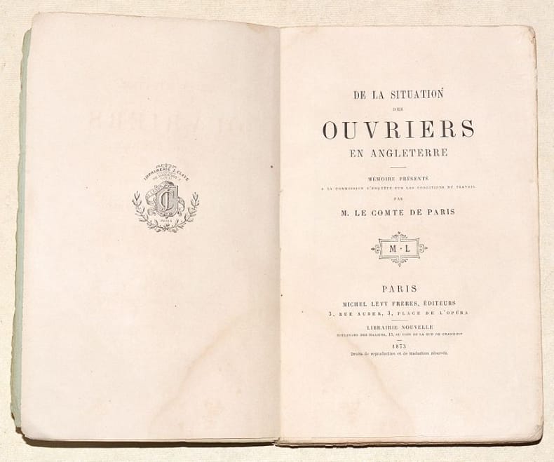 'Nouvelle collection Michel Lévy'. Nouvelle édition. Mémoire prés. à la Commission d'enquête sur les conditions de travail, par M. le Comte de paris. Classification Dewey : 942-Angleterre