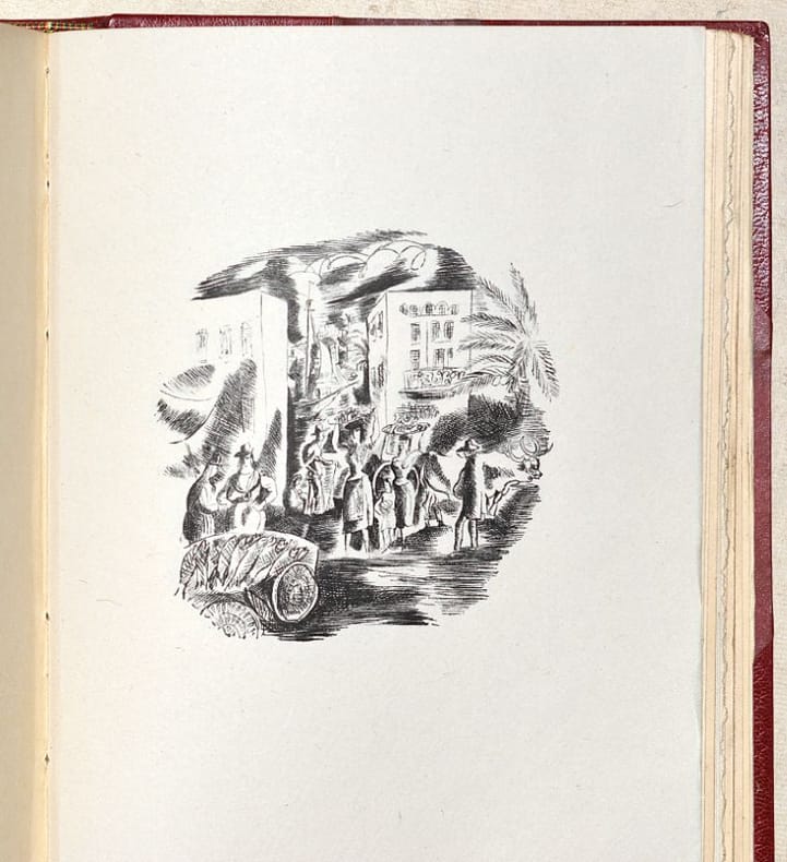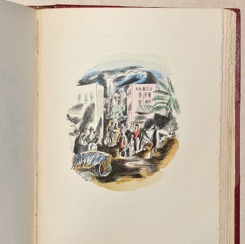 ÉDITION ILLUSTRÉE de 37 AQUARELLES par l'artiste peintre et graveuse française Hermine DAVID (1886-1970). Tirage limité à 1160 exemplaires, dont 49 hors-commerce. UN des 35 numérotés sur JAPON IMPÉRIAL (n°27), contenant une SUITE en couleurs sur Hollande et une SUITE en noir sur Chine. Il s'agit du tirage de tête après un exemplaire unique sur Japon impérial qui contient tous les dessins originaux. Cet ouvrage est «une suite d'évocations poétiques inspirées par la guerre de 1914-1918. » (Laffont-Bompiani, I, 31). BEL EXEMPLAIRE en reliure signée de FLAMMARION, en PARFAIT ÉTAT. FINE COPY. PICTURES AND MORE DETAILS ON REQUEST.