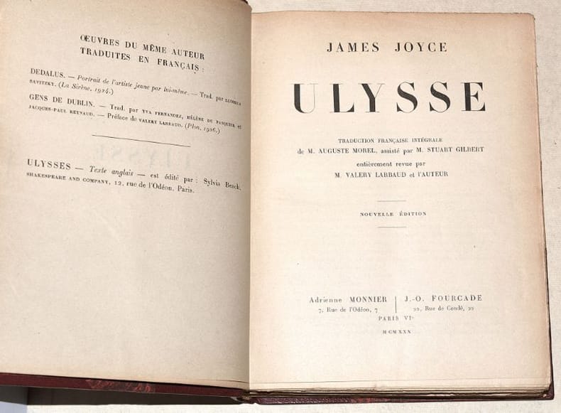 SECONDE ÉDITION de la traduction française de ce CHEF-D'OEUVRE DE LA LITTÉRATURE MONDIALE. La traduction intégrale d'Auguste Morel, assisté par Stuart Gilbert, a entièrement été revue par Valery Larbaud et l'auteur. Elle a été tirée à 3500 EXEMPLAIRES non numérotés. La première édition française a été imprimée en février 1929. Exemplaire en BEL ÉTAT conservé dans une élégante reliure de l'époque, condition peu commune. NICE COPY. PICTURES AND MORE DETAILS ON REQUEST.