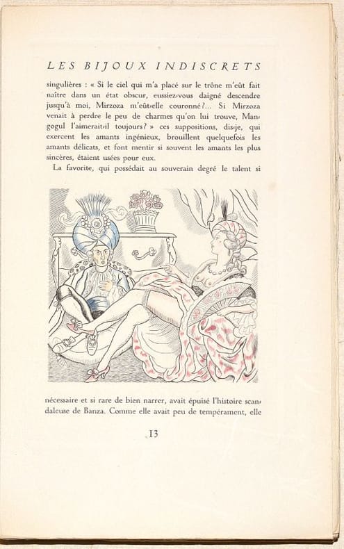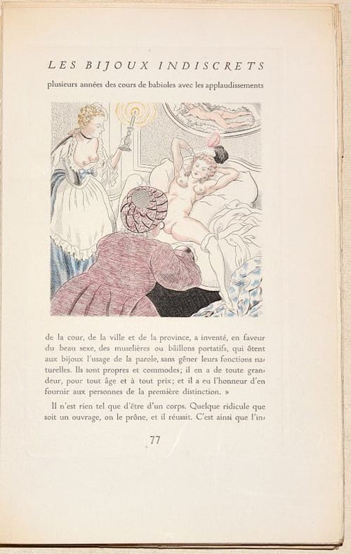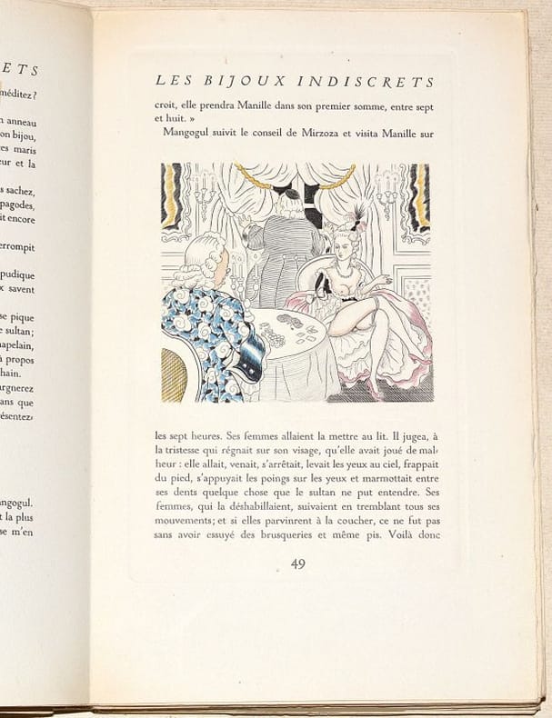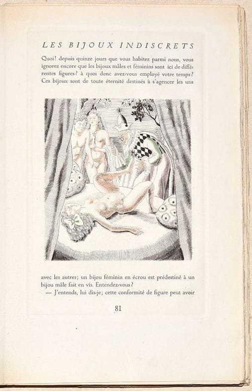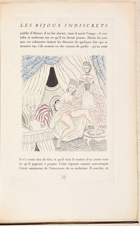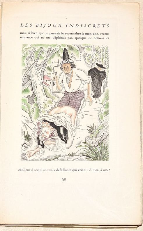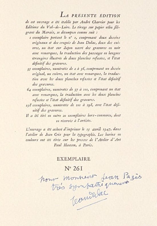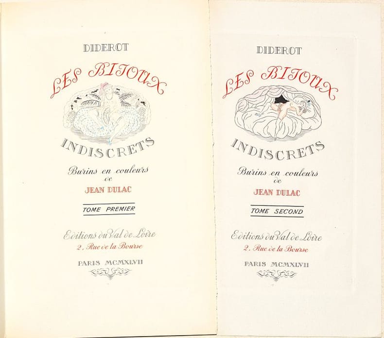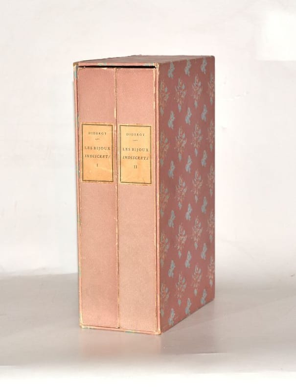 ÉDITION ILLUSTRÉE de ce ROMAN LIBERTIN publié anonymement par Denis DIDEROT en 1748. Elle comporte 36 GRAVURES au burin en couleurs par le peintre et sculpteur français Jean DULAC (1902-1968). Tirage limité à 318 exemplaires sur vélin du Marais. UN des 198 numérotés avec l'état définitif des gravures. ENVOI AUTOGRAPHE signé de l'illustrateur à la justification : « pour Monsieur Jean Pagès / très sympathiquement / Jean Dulac ». SÉDUISANT EXEMPLAIRE, aux corps d'ouvrage en PARFAIT ÉTAT, frais et sans rousseurs. NICE COPY. PICTURES AND MORE DETAILS ON REQUEST.