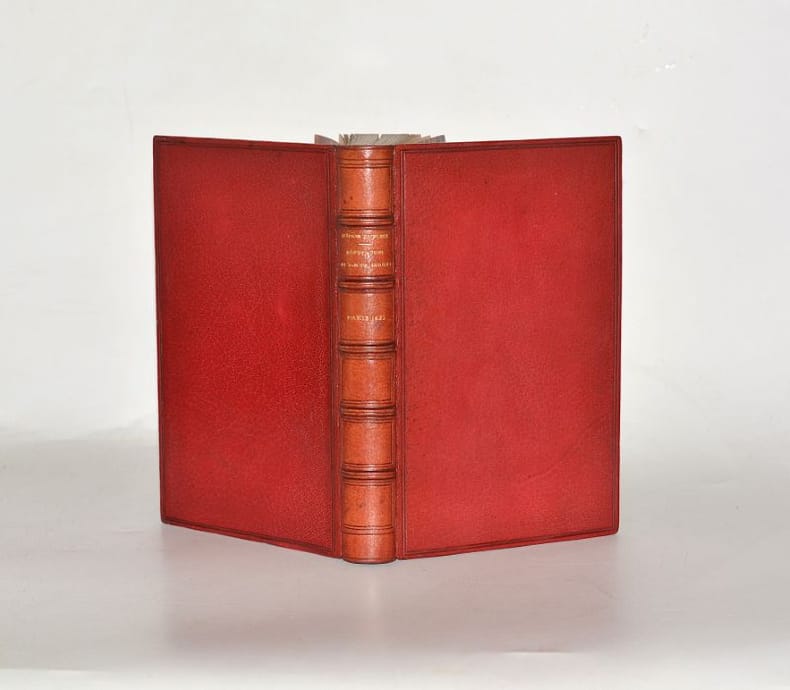 1625 Paris, Laurent Sonnius, 1625. In-12 (174 X 113 mm) maroquin framboise, encadrement de double filet à froid sur les plats, dos à nerfs orné de caissons à froid, titre doré, coupes et coiffes filetées or, bordures intérieures ornées d'une large dentelle dorée, tranches dorées sur marbrure (Closs) ; 351 pages (dont titre), (18) pages de table, (1) f. d'extrait du privilège. Teinte du dos un peu éclaircie.