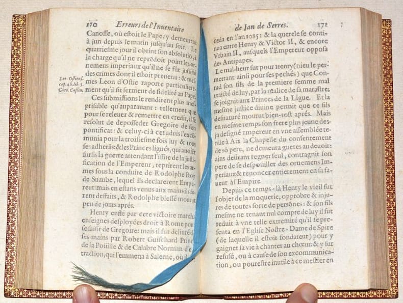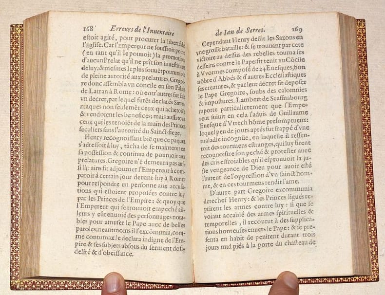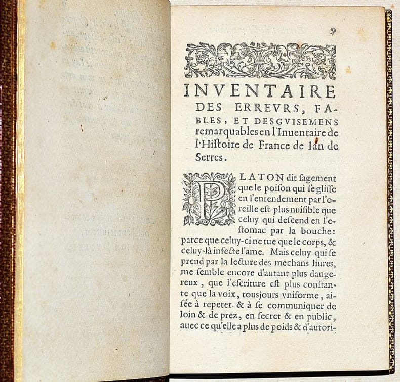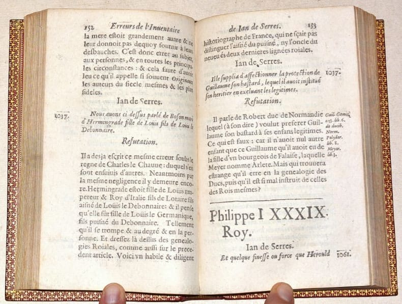 ÉDITION ORIGINALE de ce RARE OUVRAGE de l'historien, grammairien, philosophe et conseiller d'état français Scipion DUPLEIX (1569-1661). Il s'agit d'une réfutation, point par point, de l'ouvrage de Jean de SERRES (1540-1598), pasteur calviniste et historiographe français qui publia en 1597 un "Inventaire de l'Histoire de France", souvent réimprimé avec des continuations. Les premiers ouvrages de Scipion Dupleix lui valurent le titre d’historiographe de France, mais il en tira peu d’avantage et, las de courir après la fortune, il se retira dans sa ville natale (Condom, dans le Gers) avec le titre de conseiller d’État. C’est le premier auteur qui ait publié en français un cours de philosophie scolastique, et le premier historien qui ait cité en marge les sources où il a puisé les faits qu’il rapporte. BEL EXEMPLAIRE en maroquin d'A. CLOSS qui exerça à Paris de 1838 jusque vers 1870. (Hoefer, I-335 - Fléty, 45). NICE COPY. PICTURES AND MORE DETAILS ON REQUEST.