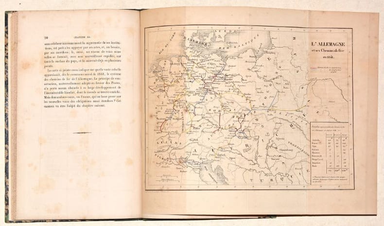 ÉDITION ORIGINALE de cet ouvrage RARE qui traite de l'amélioration des voies de communication en France et en Europe. Ouvrage bien complet de la CARTE dépliante gravée sur acier, avec rehauts en couleurs, titrée "L'Allemagne et ses Chemins de Fer en 1841". AGRÉABLE EXEMPLAIRE. PLEASANT COPY. PICTURES AND MORE DETAILS ON REQUEST.