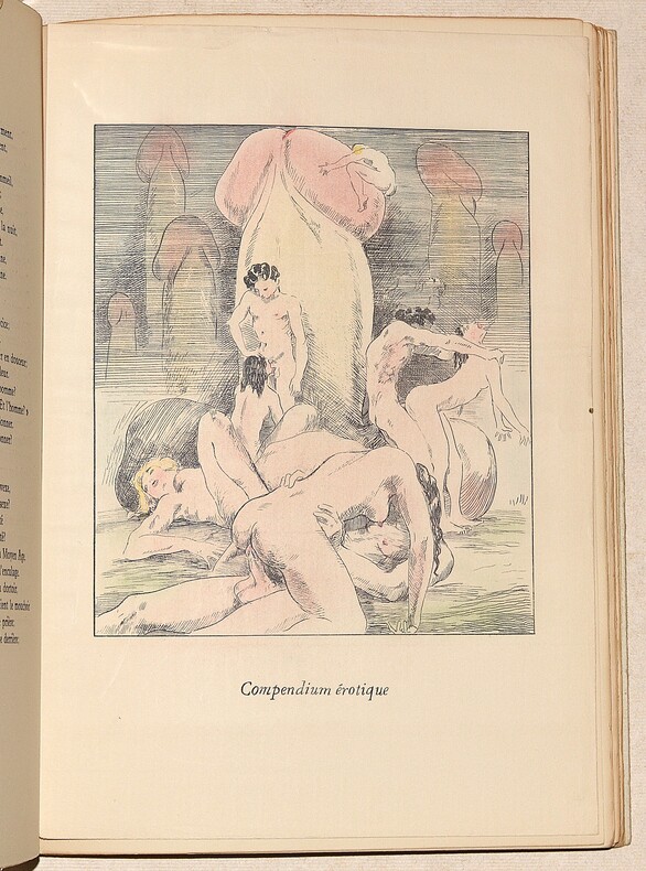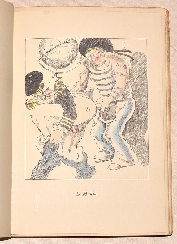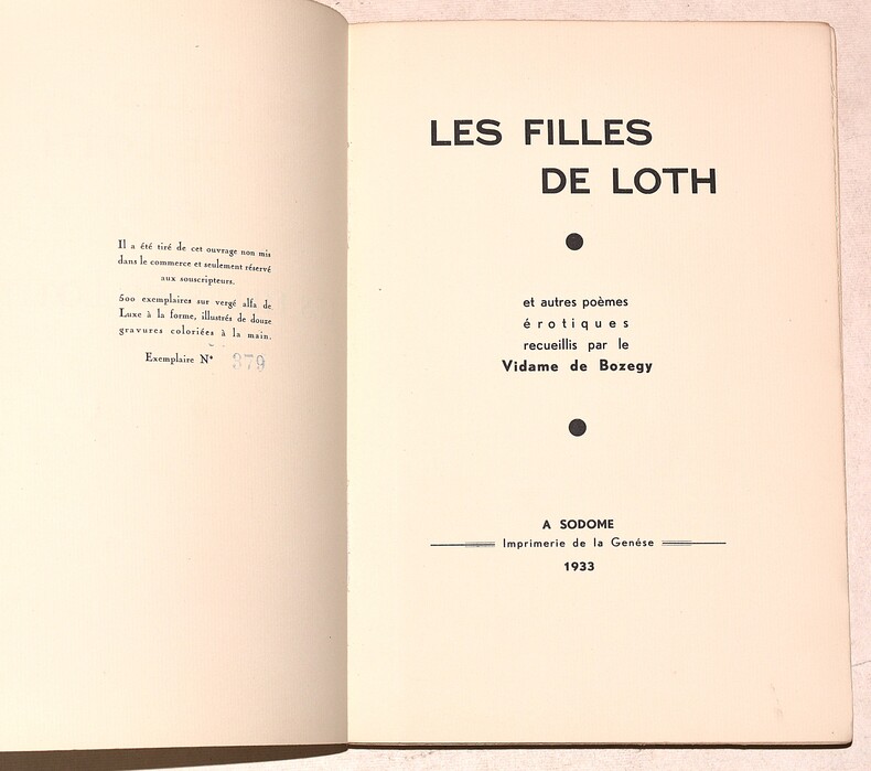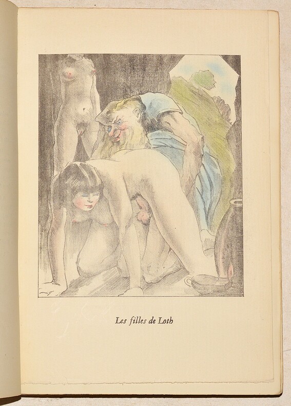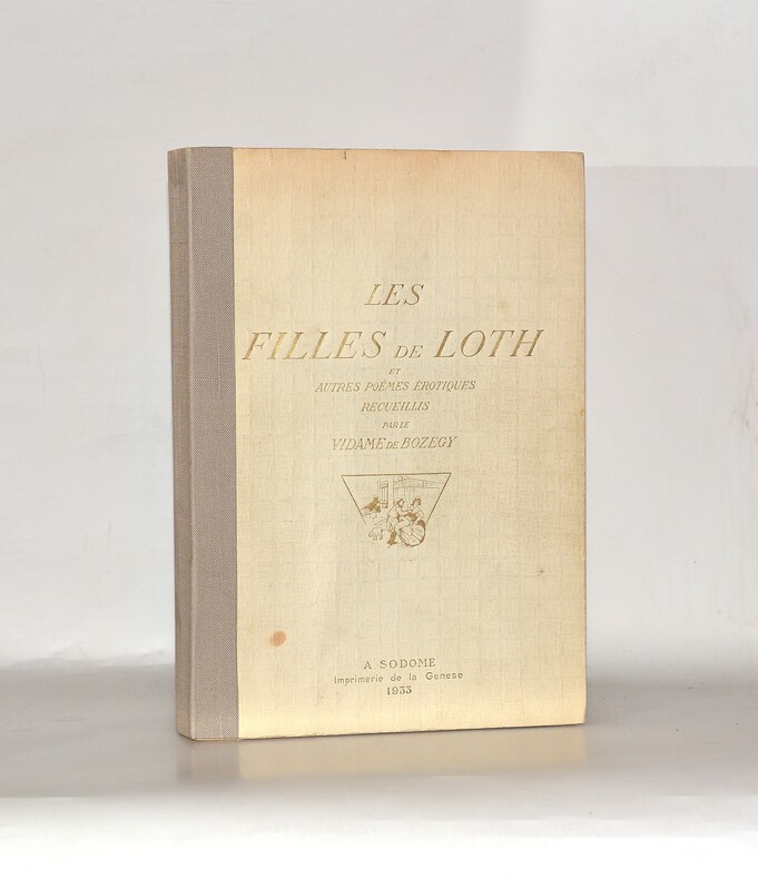 Sodome, Imprimerie de la Genèse, [Paris], 1933. 1 vol. in-4° broché, couv. rempliée imprimée en caractères dorés. Dos maladroitement consolidé (brochage faible). 11 figures hors-texte (volantes) coloriées à la main, 256 pp., (1) f. Couverture défraîchie. Il manque une figure.