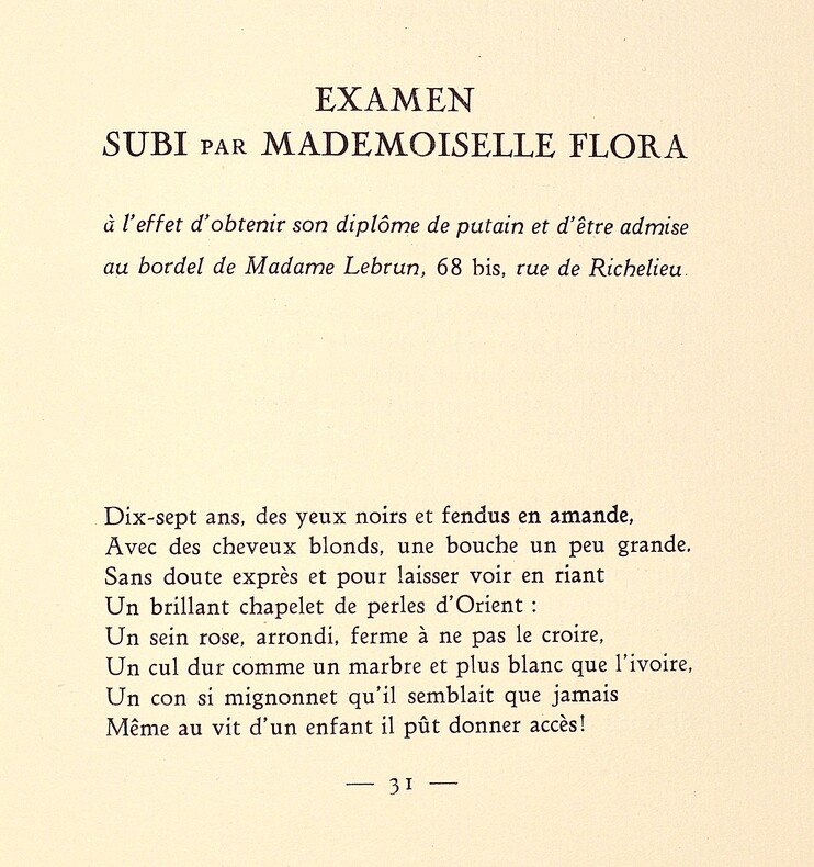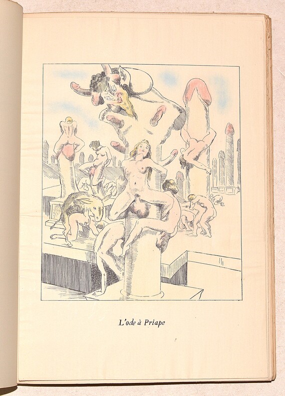 Edition illustrée de 11 figures très libres en couleurs, qui sont de la même main que celles de la trilogie érotique de Verlaine publiée en 1931. Ce recueil rassemble des poèmes érotiques de différents auteurs dont la fameuse ode à Priape de Piron, La Femme à Barbe de Maupassant, Deux gougnottes et le Théâtre érotique de M. Joseph Prud'homme d'Henry Monnier. Tirage hors commerce à 500 exemplaires sur vergé Alfa de luxe à la forme. Dutel II, 1575; Monod, 4603.