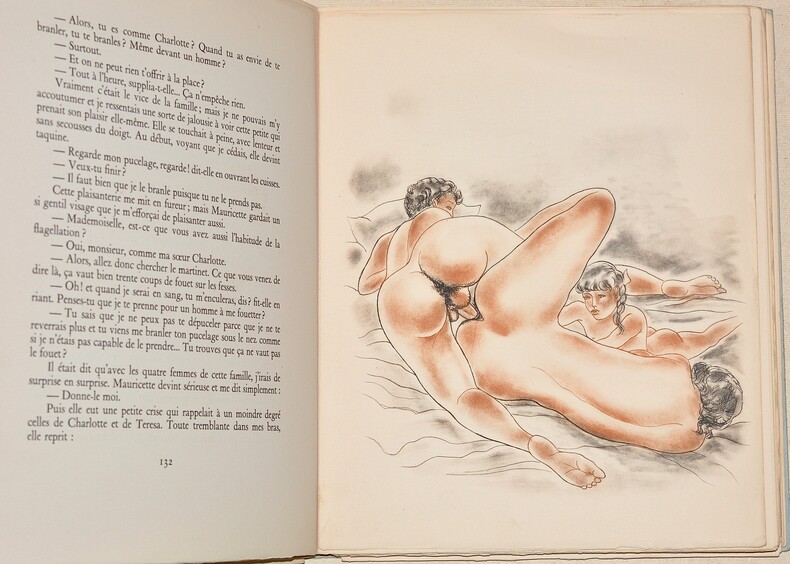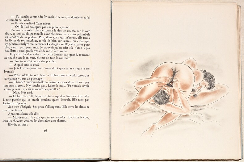 ÉDITION ORIGINALE diffusée sous le manteau, en fac-similé du manuscrit autographe. Tirage annoncé à très petit nombre et non mis dans le commerce, sur papier vélin d'Arches, filigrané Syoul Erreip (Pierre Louys à l'envers). Selon l'avis à la lectrice en exergue, cette oeuvre pornographique est une histoire vraie jusqu'aux moindres détails mettant en scène les amours du narrateur avec trois soeurs et une mère. Inspirée des relations libres qui liaient l'auteur à la femme de José Maria de Hérédia et ses trois filles, elle fut rédigée vers 1910. André Pieyre de Mandiargues y voit l'archétype du genre érotique. Dès les premières pages de Trois filles de leur mère, on sent un écrivain de race. L'histoire est emportée jusqu'à son épilogue par un souffle mêlant deux sortes de fureurs que les païens mettaient sous l'invocation de Vénus et d'Apollon, la fureur érotique et la fureur poétique (Alexandrian, 298 ; Dutel, 2516 ; Pia, p. 752). BEL EXEMPLAIRE. Photos sur demande.
