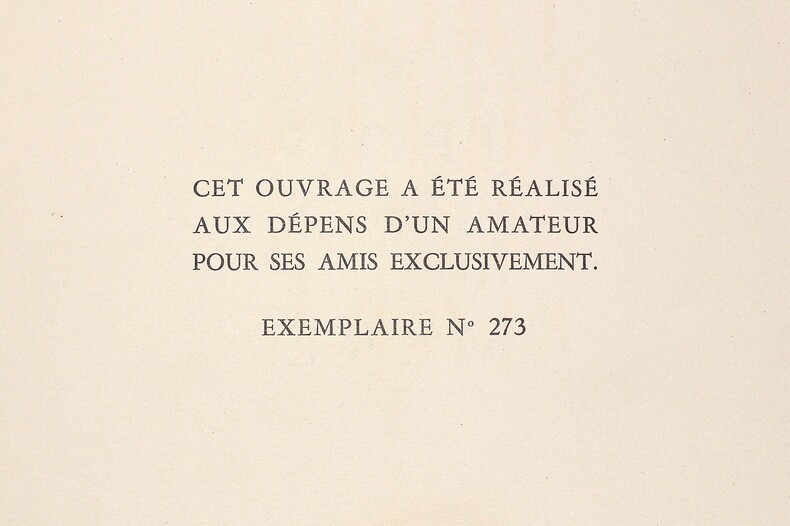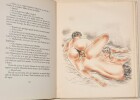 ÉDITION HORS-COMMERCE ILLUSTRÉE de 16 COMPOSITIONS LIBRES en couleurs (dont frontispice) du peintre et illustrateur français Jean BERQUE (1896-1954), élève des Nabis et réputé pour ses nus. Pas de justification de tirage : « Cet ouvrage a été réalisé aux dépens d'un amateur pour ses amis exclusivement ». Imprimé sur vélin de Lana ; cet exemplaire porte le numéro « 273 ». (Dutel, 2523 - Pia, 1449). Exemplaire en BEL ÉTAT. FINE COPY. PICTURES AND MORE DETAILS ON REQUEST.