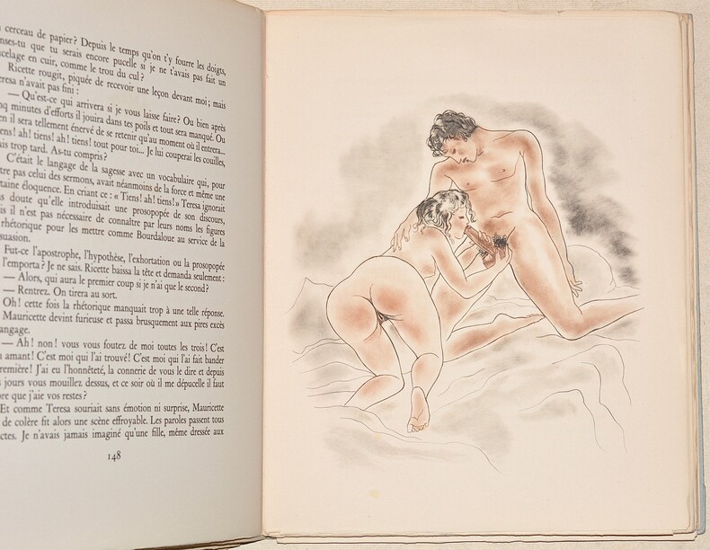 Sans reliure, boîte: Bien, 29 x 21 cm, 150 + suite, français, 1ère édition, illustrations, état du livre: Très bon Édition non reliée, avec des illustrations en couleur et une suite en noir et blanc. Boîte à tiroir avec couverture rigide (elle présente des taches et des dommages sur le dos), les pages sont coupées de manière inégale en bas et sur les côtés, le haut est coupé lisse. Trois filles de leur mère est un roman érotique que Pierre Louÿs a écrit vers 1910. L'oeuvre a été publiée clandestinement et posthumément en 1926 par René Bonnel, qui a également publié en 1928 avec Pascal Pia L'Histoire de l'oeil de Georges Bataille et Le Con d'Irène de Louis Aragon. Exemplaire numéroté 66/350. Cette édition a été imprimée à 350 exemplaires aux frais d'un amateur, exclusivement pour ses amis. [Cette description peut avoir été traduite par une IA.]