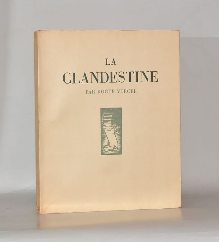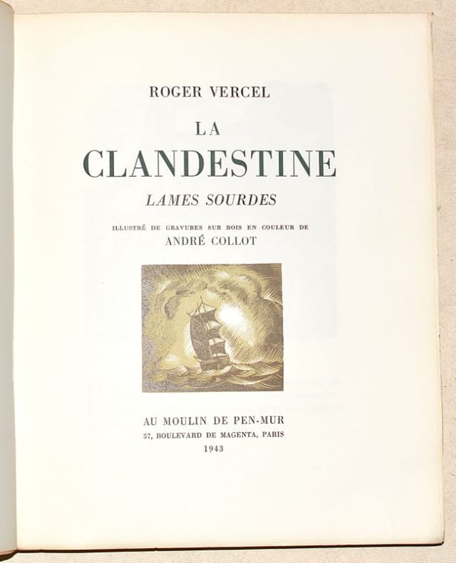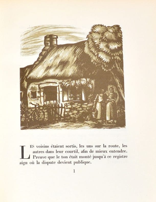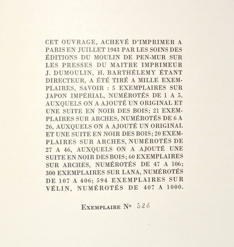 1943 Paris, Au Moulin de Pen-Mur, 1943. Grand in-quarto (285 X 230 mm) broché, couverture rempliée illustré d'un bois en couleur sur le premier plat ; (1) f. blanc, (2) ff. de faux-titre et titre, 214 pages, (1) f. de justification de tirage et (1) f. blanc. Déchirure d'1 cm sans manque et tache brune en queue du dos, plissure (2, 5 cm) en marge gauche du premier plat, 2 petites rousseurs dans les barbes.