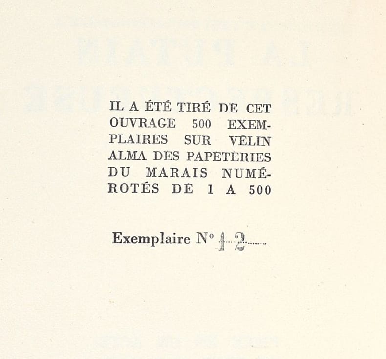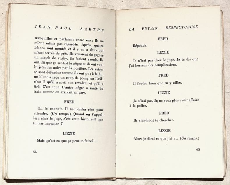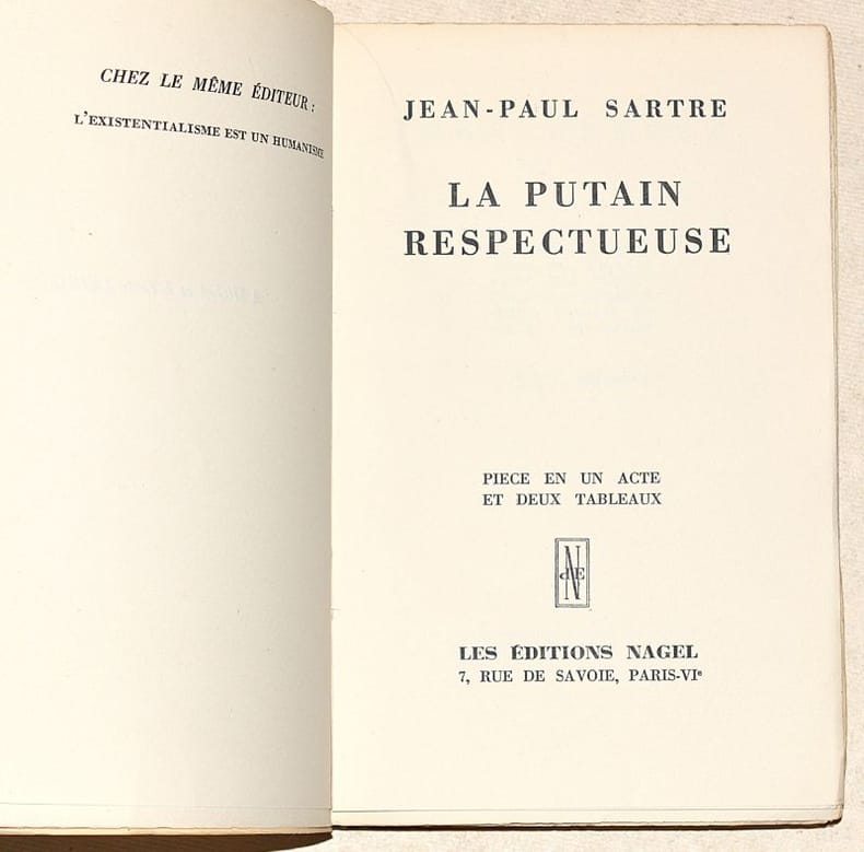 "Édition originale. Un des 500 exemplaires numérotés sur vélin Alma des papeteries du Marais, seul grand papier; celui-ci n°208. Ce qui devait à l'origine être La P… respectueuse et qui, retrouvant dans les éditions ultérieures ses points de suspension (pudiques, mais en fait terriblement évocateurs), constitue l'une des pièces les plus marquantes du Sartre dramaturge. Se déroulant aux U.S.A. la pièce met aussi en scène un N… (qui à l'époque s'écrit lui toujours en toutes lettres) jugeant au fond normal d'être accusé à tort du crime commis par un riche blanc, communiant dans une même soumission aliénée avec la malheureuse fille qui tente de le secourir, mortifiée, de son côté, d'être ainsi amenée par son sens moral inné à braver malgré elle l'ordre social. Très bel exemplaire."