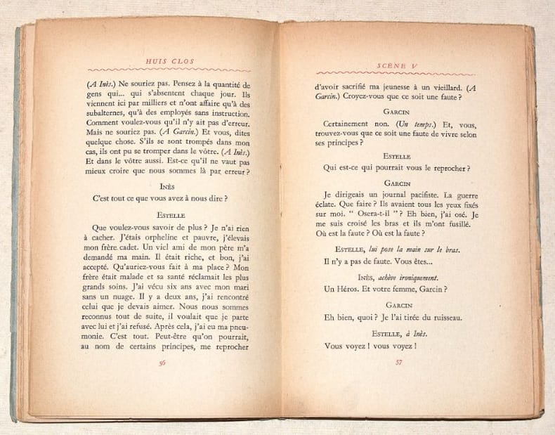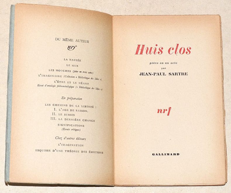 ÉDITION ORIGINALE de cette pièce de théâtre, symbolique de l'existentialisme athée, courant philosophique et littéraire représenté par Jean-Paul Sartre et Simone de Beauvoir. L'ouvrage est imprimé en rouge et noir. Tirage limité à 2274 exemplaires. UN des 250 EXEMPLAIRES hors-commerce numérotés sur papier de Châtaignier (« exemplaire H. C. 2040 »). Exemplaire en BON ÉTAT. GOOD COPY. PICTURES AND MORE DETAILS ON REQUEST.