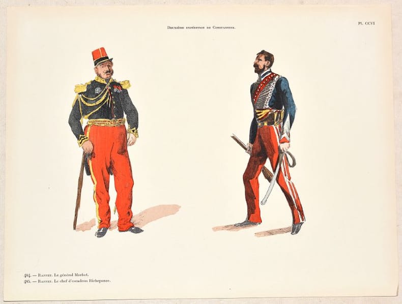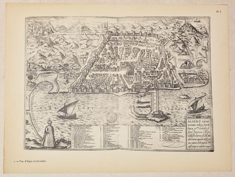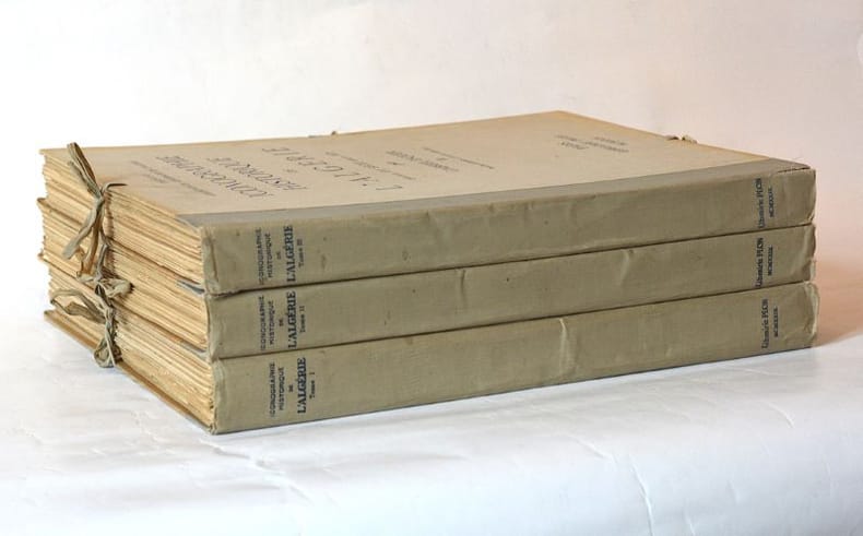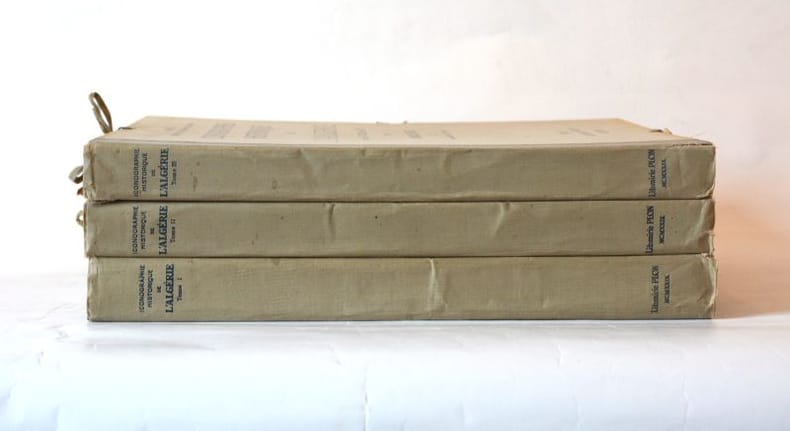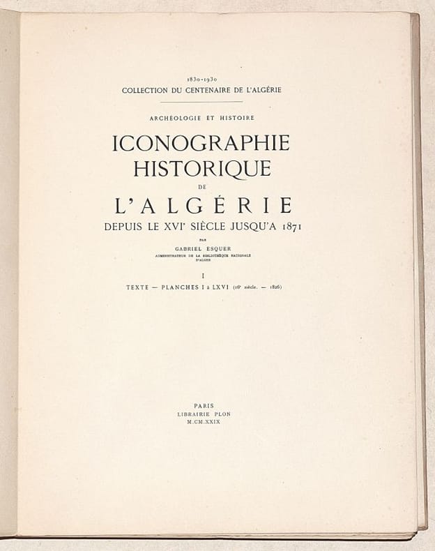 ÉDITION ORIGINALE de cette importante somme iconographique sur l'Algérie totalisant 354 PLANCHES dont 1 double et 18 en couleurs, tirées par Daniel JACOMET. Tome I : Texte explicatif et planches I à LXVI (16e siècle à 1826) - Tome II : planches LXVII à CCXVII - Tome III : planches CCXVIII à CCCLIV. « Le but de l'auteur a été de composer une histoire de l'Algérie par l'image, en reproduisant les documents iconographiques les plus importants depuis le seizième siècle jusqu'à 1871, date à laquelle le pays étant définitivement pacifié, son histoire devient administrative. [...] Cet ouvrage comprend, précédées d'une étude sur l'Iconographie historique de l'Algérie, des notices sur chacun des documents reproduits, et des tables (évènements et noms des lieux, portraits, artistes). L'essentiel de la publication est constitué par les oeuvres (peintures, dessins, estampes, images populaires, sculptures, médailles, etc.) que les évènements ont inspirées, les portraits, les vues de villes et des aspects du pays. » (Avant-propos). Exemplaire en BEL ÉTAT, COMPLET de toutes les planches et feuillets de texte. NICE COPY. PICTURES AND MORE DETAILS ON REQUEST.