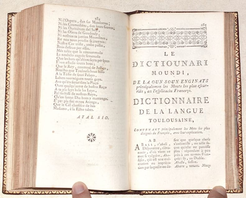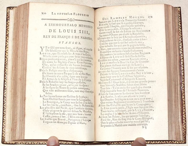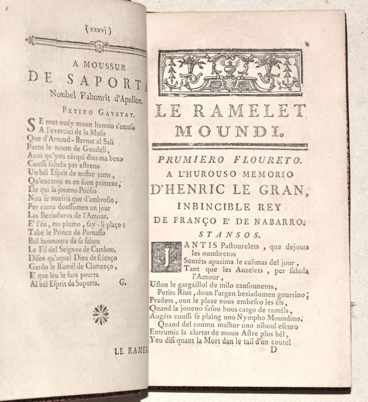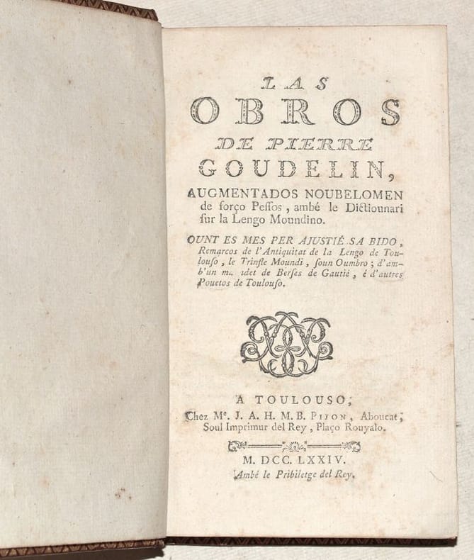 BELLE ÉDITION XVIIIe de ces poésies languedociennes, oeuvres en occitan toulousain du poète Pierre GOUDOULI ou encore Pierre GOUDOULIN (1580-1649). Elle reprend celle de 1710, augmentée de quelques pièces de Gautier et de Seré, avec le privilège accordé le 4 mai 1710 à Jacques Loyau puis cédé à Lecamus et Caranove. La première édition a été publiée à Toulouse en 1645, chez Pierre Bosc, dans le format in-quarto. Cette édition contient le texte occitan SEUL du "Ramelet moundi", "Le Broutou noubelet", "La noubélo Floureto del Ramelet Moundi" et le "Recul d'autros péssos" ; les feuillets liminaires qui constituent "L'imprimeur au lecteur" (une page) et la "Lettre de M*** à un de ses amis de Paris" (pp. IV à XXIX) rédigée par Germain LAFAILLE (1616-1711), sont en français ; les dédicaces (pp. XXX à XXXVI), dont notamment celles à Adrien de Montluc et à Monsieur de Saporta, sont en occitan ; la dernière partie de l'ouvrage (95 pages) est constituée d'un IMPORTANT "DICTIONNAIRE DE LA LANGUE TOULOUSAINE, contenant principalement les Mots les plus éloignés du François, avec leur explication". (Noulet, "Oeuvres de Pierre Goudelin", page LII : « Jolie édition »). TRÈS BEL EXEMPLAIRE en maroquin décoré de l'époque, frais, à la reliure intacte, condition rare. FINE COPY. PICTURES AND MORE DETAILS ON REQUEST.