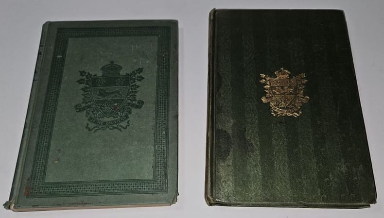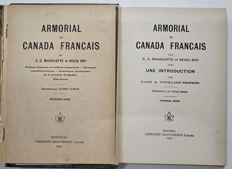 1915-1918, in-8 illustré, 2 volumes : xiii, 152p.; xv, 151p. Cartonnage de l'éditeur aux armes de la Province : papier rouge pour le premier volume qui est cousu et papier kraft imprimé en vert pour le second qui est agrafé. :: Noblesse française et noblesse canadienne - Baronnets canadiens-français - Lieutenants-gouverneurs de la Province de Québec - Notes diverses... :: Cartonnage brisé pour le premier volume et bon état pour le 2e bien que déboîté.