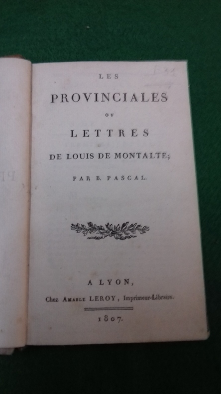 Jolie édition des «Provinciales» (1657), grand classique de la pensée française du XVIIe siècle. Au centre du problème: la Grâce et l'affrontement entre jansénistes et jésuites. Image disp.