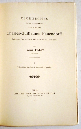 Complet des 3 parties parues. Ouvrage qui dément la thèse de l'authenticité des origines royales de Nauendorff. Provient de la bibliothèque du "Prince René-Louis-Charles de Bourbon (Naundorf)" dont il porte l'inscription dorée dans l'angle inf. droit du plat sup.