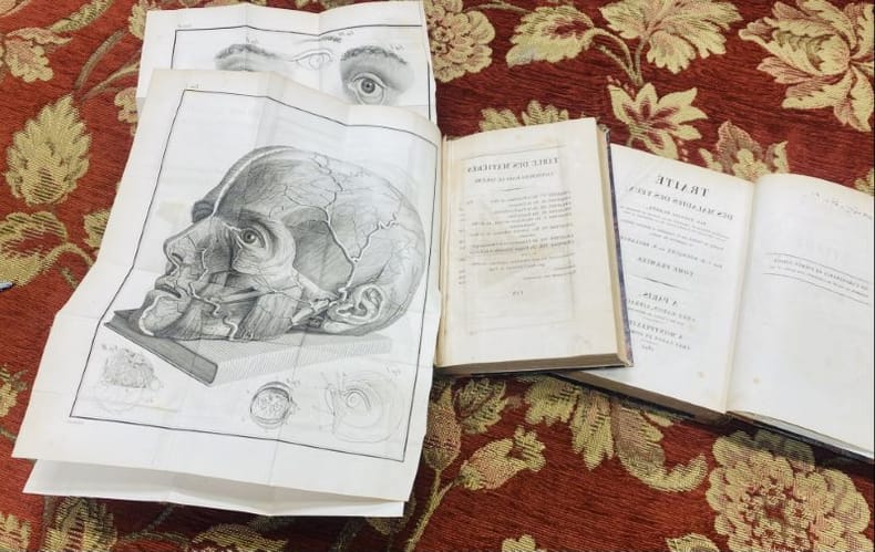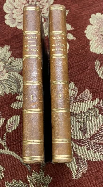 Cinquième édition (la première française est à la date de 1802, avec la traduction de Léveillé). Bel exemplaire de cet ouvrage, illustré de 4 planches hors texte dépliantes dessinées et gravées par Adam représentant les voies lacrymales, certaines maladies des yeux et des instruments de chirurgie. Important ouvrage de ce grand chirurgien italien : la fistule lacrymale, la phlogose, les ulcères de la cornée, étaient autant de pathologies sur lesquelles on avait peu de renseignements, les écrits de Scarpa permirent ainsi de les passer dans l’enseignement et la pratique.