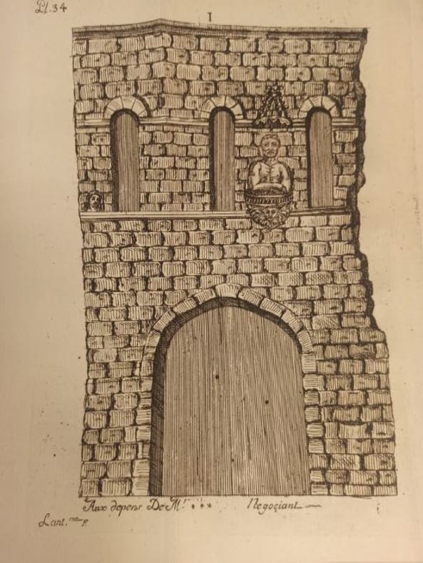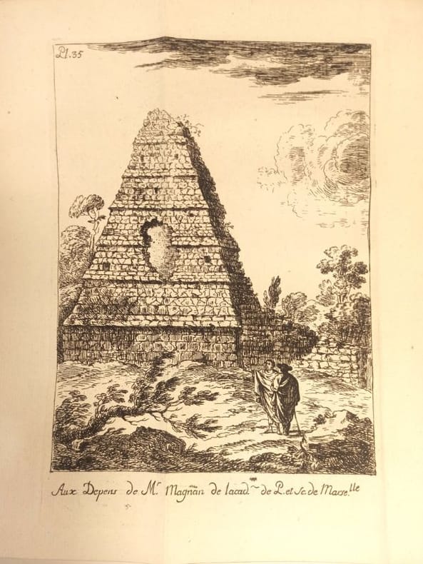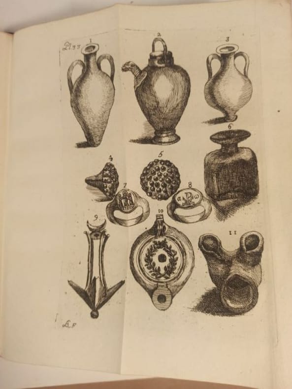 Ouvrage important, illustré de 47 planches hors texte (42 planches numérotées, et 5 planches non numérotées d'épigraphies latines et grecques). Le pubis de la statue de la planche 16 n'a pas été gratté, comme dans de nombreux exemplaires.