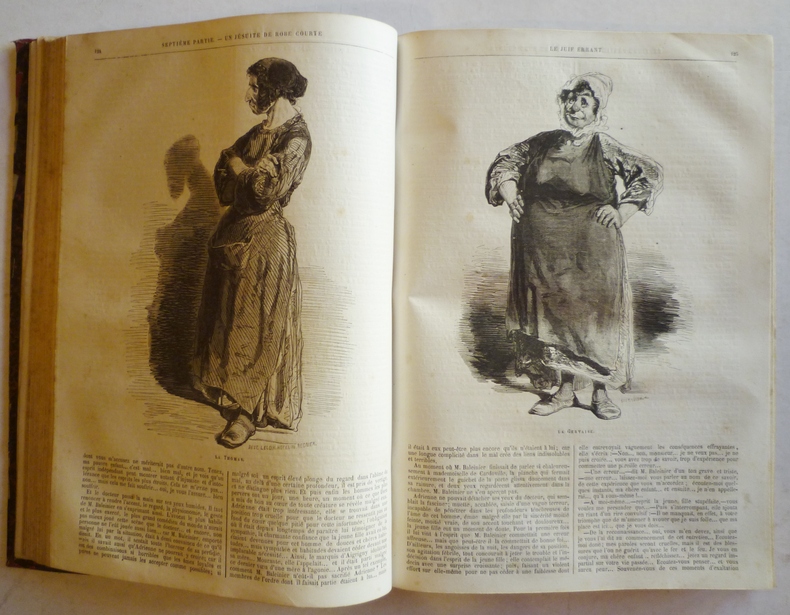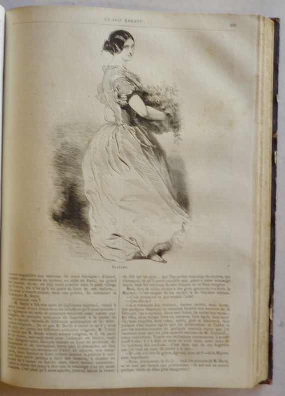 Première édition superbement illustrée par Gavarni de 83 planches hors-texte ainsu que de 600 vignettes in-texte. Entre les pages 254-255 du troisième volume, notre exemplaire est bien complet de la carte dépliante représentant la Marche progressive du Choléra Morbus en Asie et en Europe depuis 1817 jusqu'en 1832. Reliures en demi chagrin marron, dos légèrement éclaircis à quatre nerfs sertis de pointillés dorés et ornés de doubles caissons dorés et décorés, plats de papier marrbé, gardes et contreplats de papier à la cuve. Quelques rousseurs comme habituellement. Le juif errant est un des plus grands succès de librairie du XIXe siècle, paru juste après Les mystères de Paris. Aux qualités de narration des Mystères de Paris, Le juif errant ajoute l'intervention du surnaturel et du fantastique, représentés par le vagabond légendaire qui donne son nom au livre. Précédé par le choléra, qui inspire à Eugène Sue des pages d'anthologie, le Juif légendaire revient d'au-delà des mers et d'au-delà des siècles pour empêcher la Compagnie de Jésus de s'emparer d'une fabuleuse fortune en éliminant un par un ses héritiers. Le juif errant étant un roman d'aventures se déroulant aux quatre coins du monde. Il entraîna en France un mouvement anti jésuite. Si Eugène Sue est plus ou moins oublié aujourd'hui, il était non seulement l'un des romanciers les plus célèbres du XIXe siècle mais le plus lu en Europe, et même Dostoievski était coutumier de sa lecture. Peu d'écrivains de cette époque ont bénéficié des qualités éditoriales dont font preuves Les mystères de Paris et Le juif errant, abondamment et superbement illustrés. Il était pour Dumas son principal concurrent, et ce dernier pensait qu'il lui survivrait même. - Photographies et détails sur www.Edition-Originale.com -