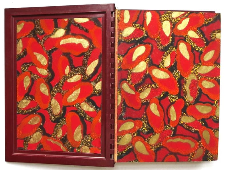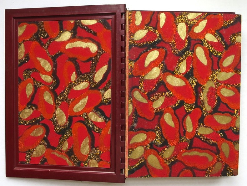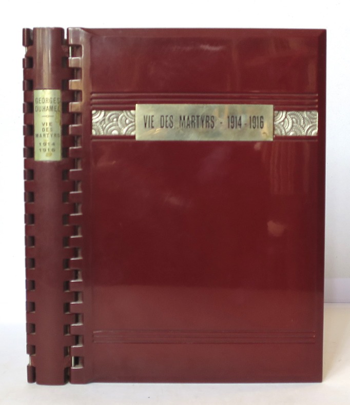 Paris Albin Michel 1922 In-8 reliure en bakélite bordeaux, mors montés sur charnières de type « piano », plats biseautés en bordure, avec sur le premier trois filets horizontaux en creux dans la partie inférieure ainsi que dans la partie supérieure, mais ornés d’une frise et de filets horizontaux moulés, cette frise sertie d’une plaque de métal argenté portant le titre gravé, petite plaque de même au dos, tête dorée, doublures et gardes de papier peint dans les tons rouges et noirs, rehaussée d’or, couverture. 246 pp. (Reliure art-déco signée Jotau, avec la mention à l’intérieur du second plat : « breveté S.G.D.G. ».