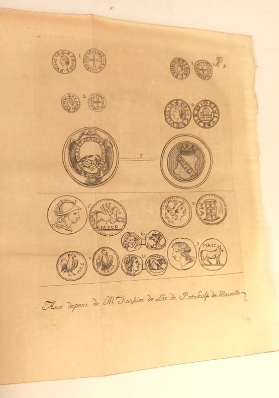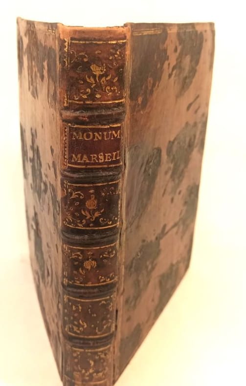 Chez Jean Mossy Marseille 1773 Petit in-4, ( 250 X 200 mm ) de 2 ff. n.ch. ( titre, approbation, errata ) 296 pages, demi-basane fauve, dos à nerfs ornés de fleurons dorés. ( Reliure postérieure ). Illustré de 47 planches gravées dépliantes, 42 d'entre elles réunissant un très grand nombre de monnaies, vestiges archéologiques, stèles, 2 vues, 1 plan et 5 planches regroupant 31 inscriptions. Dos passé, le titre, les pages 55 56 239 à 250 et 255 à 258, les planches 7 16 38 et 40, sont en photocopie. BON EXEMPLAIRE bien reconstitué, peu commun. De la bibliothèque "Jacobus Decimus BLANC" ( ex-libris ).