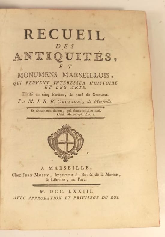 Chez Jean Mossy Marseille 1773 Petit in-4 ( 255 X 195 mm ) de 2 ff. n.ch. ( titre, approbation, errata ) 296 pages, reliure de lépoque pleine basane fauve, dos à nerfs orné de caissons de double filet doré fleuronnés, toutes tranches rouges. Edition originale illustrée de 47 planches gravées dépliantes, 42 d'entre elles réunissant un très grand nombre de monnaies, vestiges archéologiques, stèles, 2 vues, 1 plan et 5 planches non chiffrées regroupant 36 inscriptions d'épigraphies latines et grecques, gravées sur bois. Au bas de la plupart des planches gravées, on peut retrouver le nom des personnes les ayant financées.Seul ouvrage ancien donnant les monuments antiques de Marseille, les bas-reliefs, les monnaies. Ces gravures hors-texte sont l'uvre de l'artiste aixois Barthélémy LANTELME. GROSSON fut un grand antiquaire et son livre est fort précieux car il représente des antiques depuis lors disparus. A son époque déjà, le Comte MOSZYNSKI, célèbre voyageur polonais qui visita la Provence à la fin du XVIIIème siècle écrivait: "Je crois que sans G. GROSSON qui est non seulement amateur mais connaisseur érudit, ses concitoyens ignoreraient la plus grande partie des objets de ce genre que cette ville produit ou possède". Cet ouvrage est considéré "Comme une des plus belles éditions du XVIIIème en Provence" ( Billoud, 103 )."Coiffe supérieure absente, petites usures aux coins, BEL EXEMPLAIRE, peu commun.