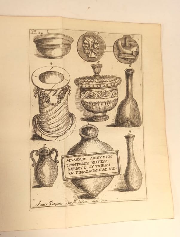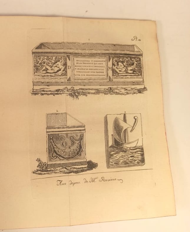 Ouvrage important, illustré de 47 planches hors texte (42 planches numérotées, et 5 planches non numérotées d'épigraphies latines et grecques). Le pubis de la statue de la planche 16 n'a pas été gratté, comme dans de nombreux exemplaires.