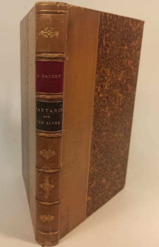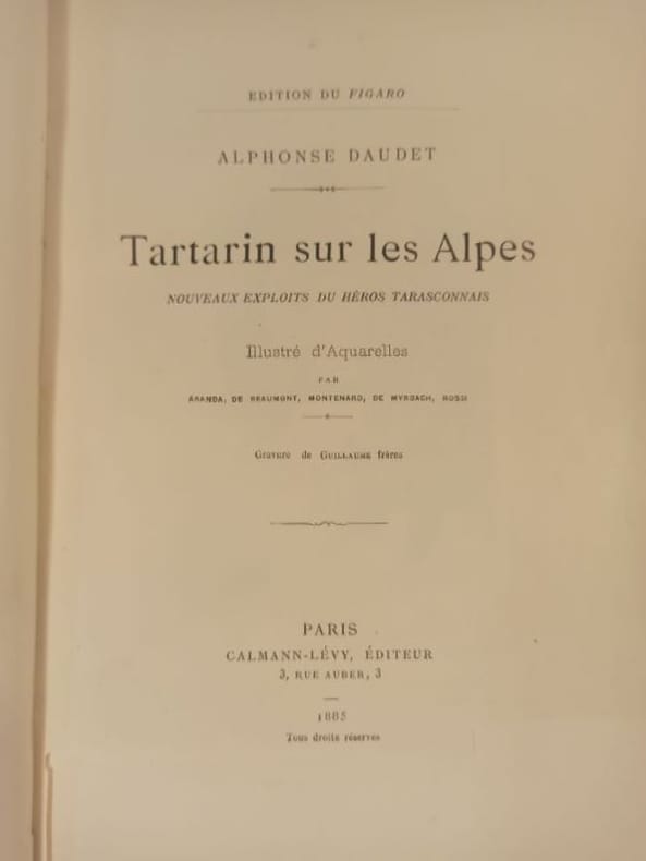 Paris Calmann-Lévy, "Edition du Figaro" 1885 1 vol. relié "Tartarin sur les Alpes. Nouveaux exploits du héros tarasconnais". In-8, demi-chagrin rouge, dos à nerfs, 334 pp. Edition originale illustrée de nombreuses aquarelles par Aranda, de Beaumont, Montenard, de Myrbach, Rossi d'après des gravures de Guillaume Frère. Bon exemplaire en reliure d'époque avec deux ex-libris gravés.