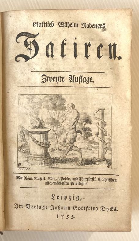 Seconde édition des Satires complètes de Rabener, que l'on a autrefois comparé à La Bruyère. Quatre amusantes gravures avec scènes de satires, en vignettes sur les pages de titre de chaque partie. Bel exemplaire.