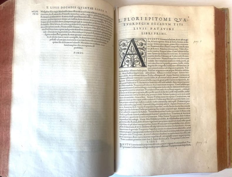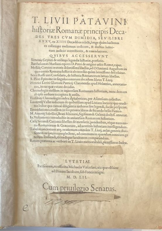 Agréable exemplaire de cette oeuvre majeure de l’antiquité, que l’auteur ne cessa de remanier toute sa vie durant en 142 livres. L’ouvrage était si long et si coûteux que seules les bibliothèques publiques pouvaient se le procurer. Très vite, ne furent publiés que des sommaires (perochiae). Ne subsiste donc que les livres sur la 1re décade : des origines à la 3e guerre samnite (293 av. J.- C.) et les 3e, 4e et 5e (partiellement) de la 2e guerre punique à la conquête de la Macédoine (167 av. J.- C.). En tout 35 livres, complétés par les résumés de tous les autres. L’édition proposée est soigneusement imprimée par Michel de Vascosan dans une agréable typographie, émaillée de lettrines ornées. Elle s’ouvre par une préface de l’humaniste Simon Grynaeus, la section sur la topographie de Rome est l’oeuvre de Bartholomé Merlian. Pour le texte de Tite Live, elle reproduit l'édition établie par Curion corrigée sur plusieurs manuscrits et éditions imprimées. Elle est augmentée de petits écrits de Corvin, Sextus Ruffus et de Florus, les annotations sont de Glareanus, la chronologie et celle de Lorenzo Valla à qui l’on doit les textes difficilement reconstitué des livres 21 à 26, les annotations sont de Sigismond Gelenius... On doit enfin la deuxième partie, entièrement composée en caractères italiques au philologue et historien suisse Glaréan. Suivent 13 feuillets d’index sur deux colonnes des noms cités, un tableau chronologique des faits (32 ff) et un index des événements et des lieux.
