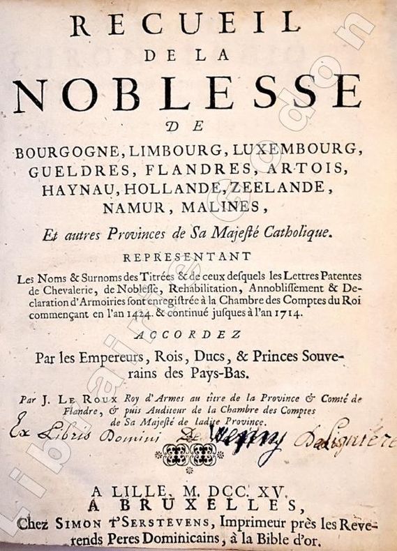 Roi d'armes au titre de la province et comté de Flandre et auditeur de la chambre des comptes de la même province, Le Roux donna, en 1708, une première édition de cet ouvrage sous le titre de "Théâtre de la Noblesse de Flandre et d'Artois et autres provinces...". L'édition de 1715, qui est la seconde, est augmentée, et couvre la période 1424-1714. (Guigard, Héraldique de la France n° 3091)Saffroy II 22300: "L'auteur était roi d'Armes et auditeur en la chambre des comptes de Lille. Son livre est utile surtout pour la période antérieure au XVIIe siècle".Bon exemplaire.