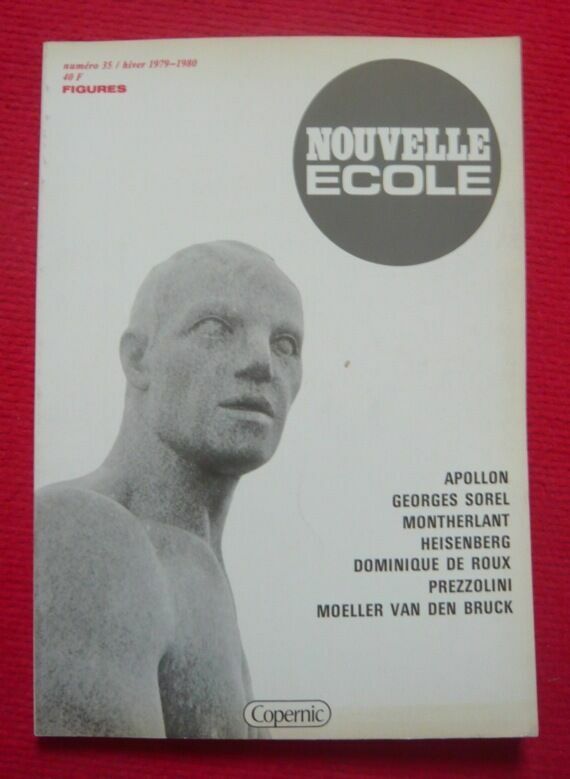 "1980. Paris Éditions Nouvelle Ecole revue trimestrielle 1980 - Broché 21 cm x 29 5 cm 138 pages - Texte collectif sur Apollon Georges Sorel Montherlant Heisenberg Dominique de Roux Prezzolini Moeller Van den Bruck - Nombreuses photos N&B in-texte - Bon état"