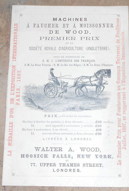 "1867. Londres Walter A. Wood s.d. (circa 1867) - Broché 14 cm x 21 cm 6 pages (non paginé) ills noir & blanc in texte - Présentation des moissonneuses et faucheuses en français et en espagnol tarifs en livres sterling - Très bon état"