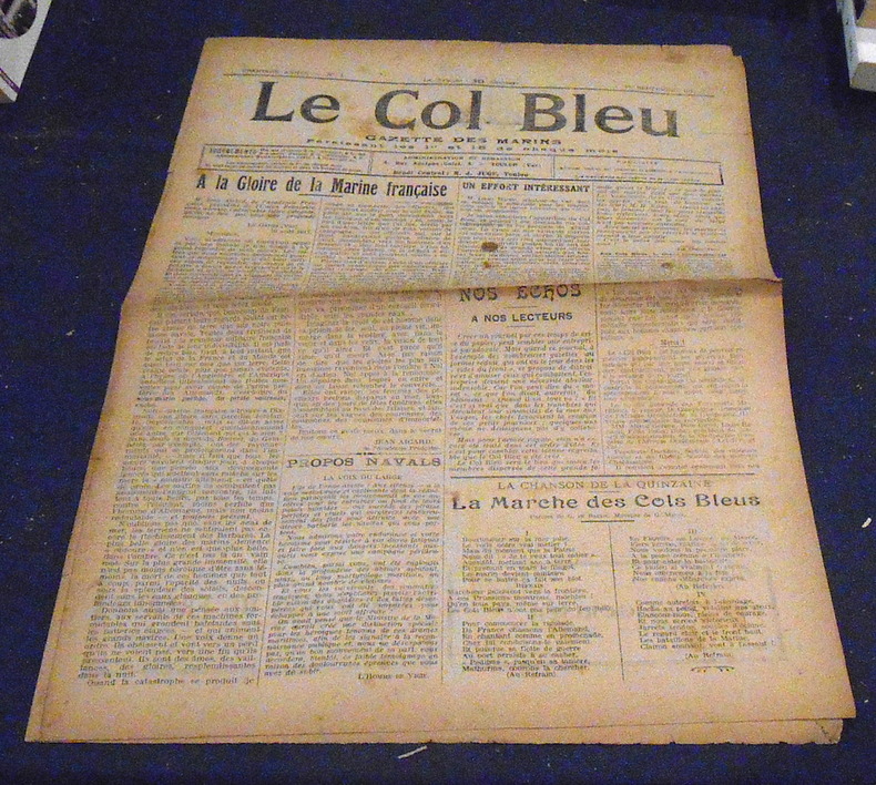Le Col Bleu Gazette des Marins Toulon, bimensuel, n°1, 1er septembre 1917, 17, 26 et 29, 1er novembre 1918. Plié, 31 cm x 44,5 cm, 4 pages. Articles anonymes, publicités. Bon état